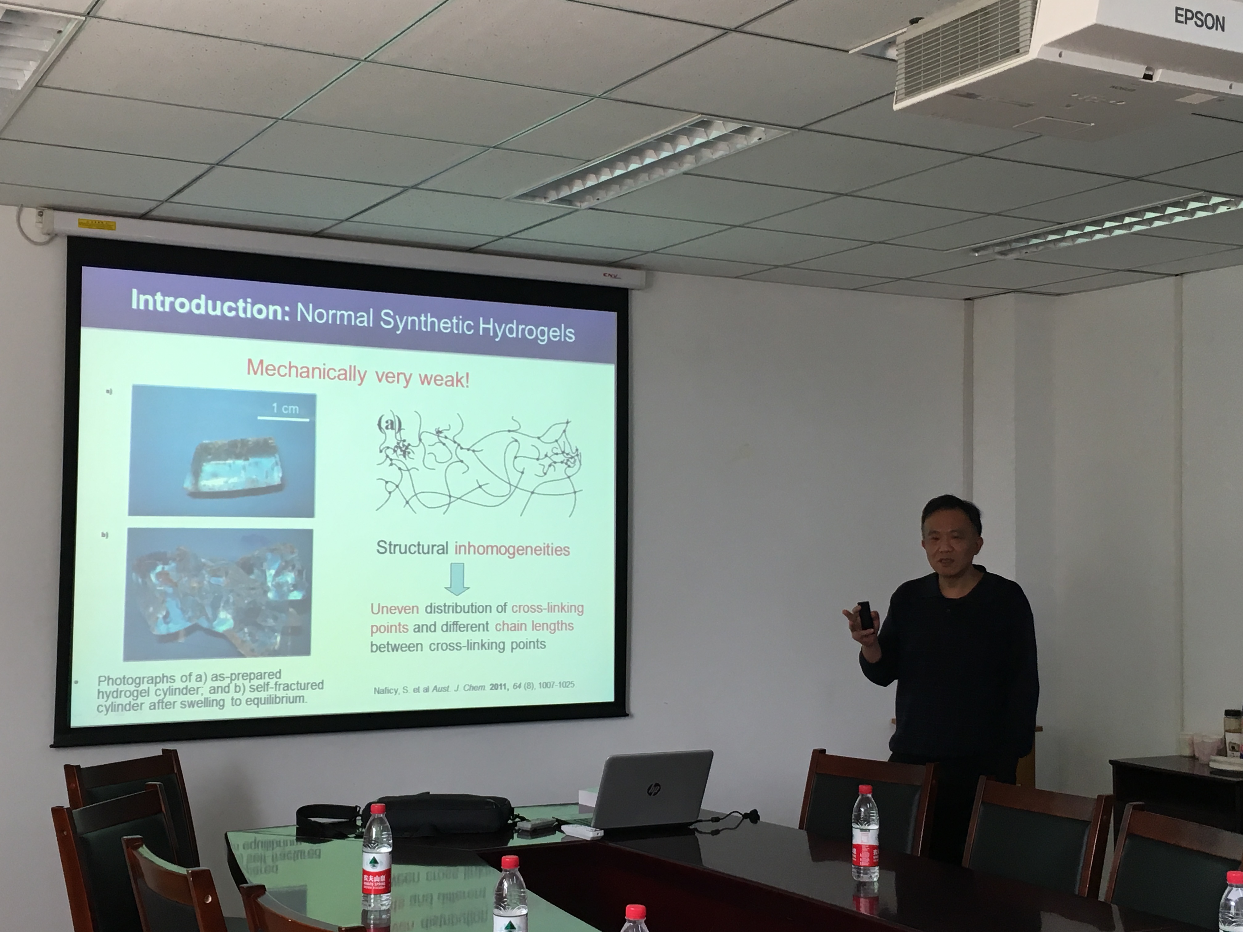 部分青年教师、研究生代表参加了本次活动。汪辉亮教授结合本组科研方向和进展,做了题为“具有优异力学性能的水凝胶”的主题报告,报告结合自身的科研经历,深入浅出、内容丰富而详实,引起了相关领域研究工作者和研究生的极大兴趣。随后,汪辉亮教授与在座师生进行了热烈的讨论并就相关问题进行了深入的交流探讨。