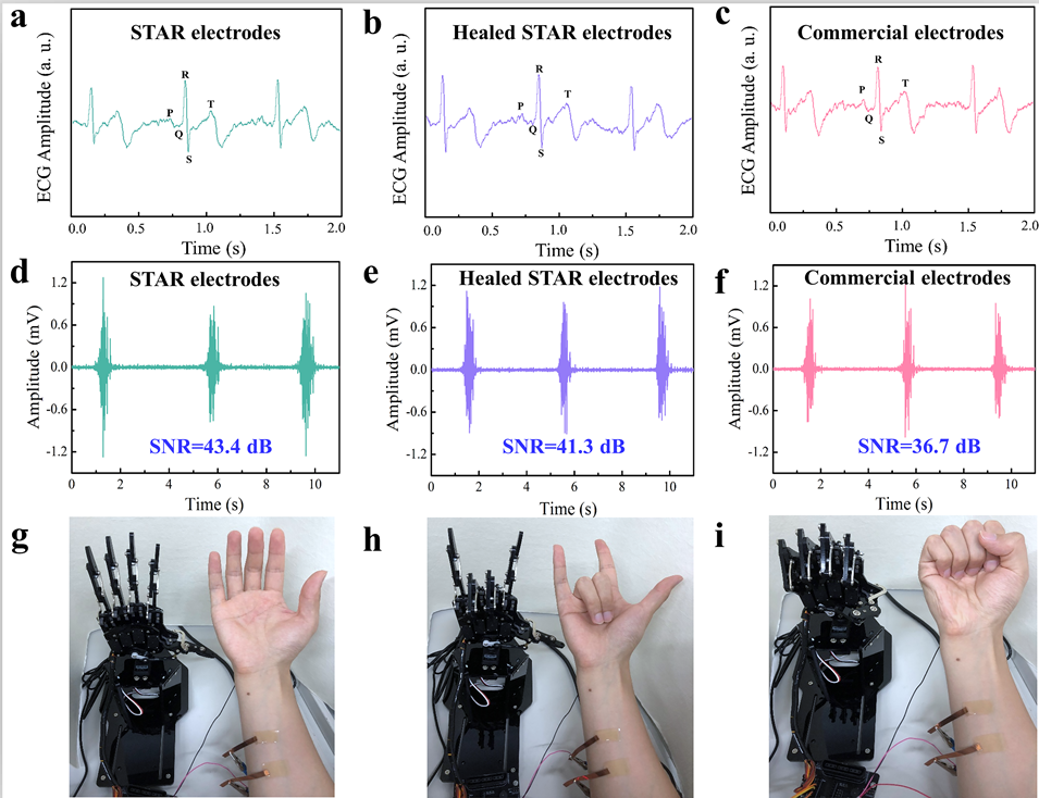图二.电生理信号检测和人机交互。(a)STAR电极(b)自治愈后的STAR电极以及(c)商用凝胶电极记录的心电信号。(d)STAR电极(e)自治愈后的STAR电极以及(f)商用凝胶电极记录的肌电信号。(g-i)STAR电极控制机械手进行人机交互,可以识别不同的手势:(g)伸手,(h)“ i-love-u”手势,以及(i)握拳。
