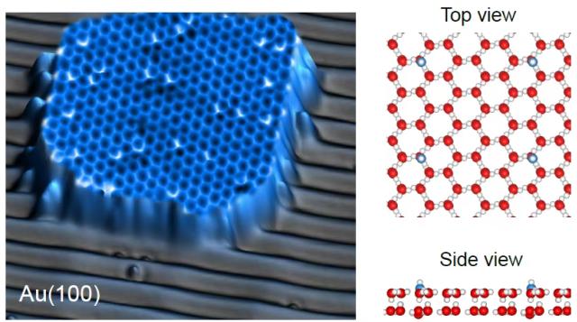 Au(100)表面容易发生528重构,形成周期性一维条带(间距:1.44 nm);该一维受限,非平整的表面为验证二维六角冰的本征性提供了一个绝佳的平台。在本工作中,研究人员通过精确调控衬底温度和水分子沉积速率,成功在Au(100)-528表面长出二维冰;进一步利用qPlus型原子力显微镜技术,并将针尖修饰一氧化碳分子,获得二维冰的原子级分辨图像(图1),证实它就是“互锁型”双层二维六角冰。该本征二维冰结构稳定,与衬底晶格非公度,“地毯式”生长并平铺在Au(100)一维受限的衬底上。