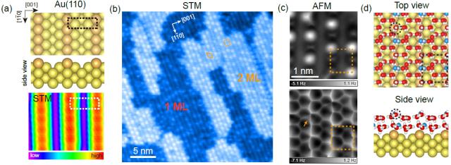 图2 (a) Au(110)-12 重构表面结构示意图和STM原子分辨图 (b) Au(110)-12表面二维冰的STM图 (c) 双层六角冰的高分辨AFM图 (d) 双层六角冰的原子结构模型图