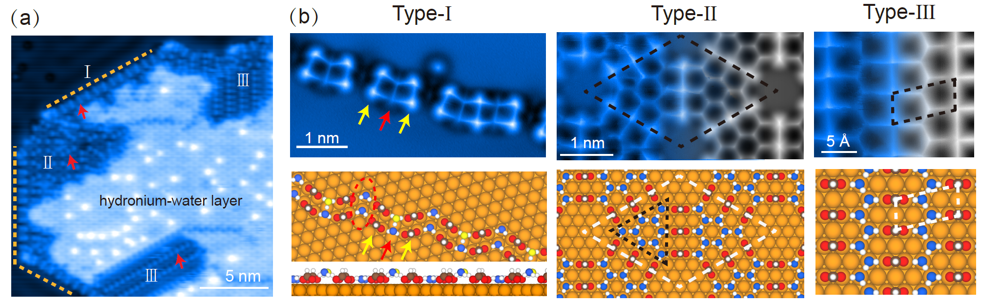 图2:水分子促进甲酸分子脱氢。(a)Cu(111)表面水合氢离子和甲酸根离子相分离的STM图。(b)甲酸根离子-水分子混合氢键网络的高分辨AFM图及结构模型图。