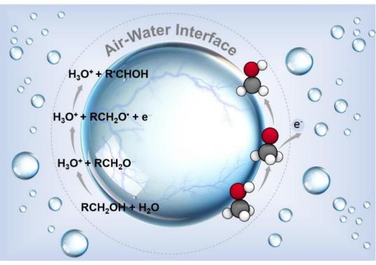 理论模拟揭示了这一过程分为三个步骤。首先,在微滴表面的部分溶剂化效应和电场的协同作用下,醇分子可以电离生成RCH2O-和水合氢离子;QM/MM分子动力学模拟进一步表明,RCH2O-在气液界面能够形成RCH2O•自由基和水合电子;最后,RCH2O•异构化为更稳定的R•CHOH,而溶剂化效应和电场作用在这一过程中起到催化作用。这些计算结果得到了质谱实验的证实。