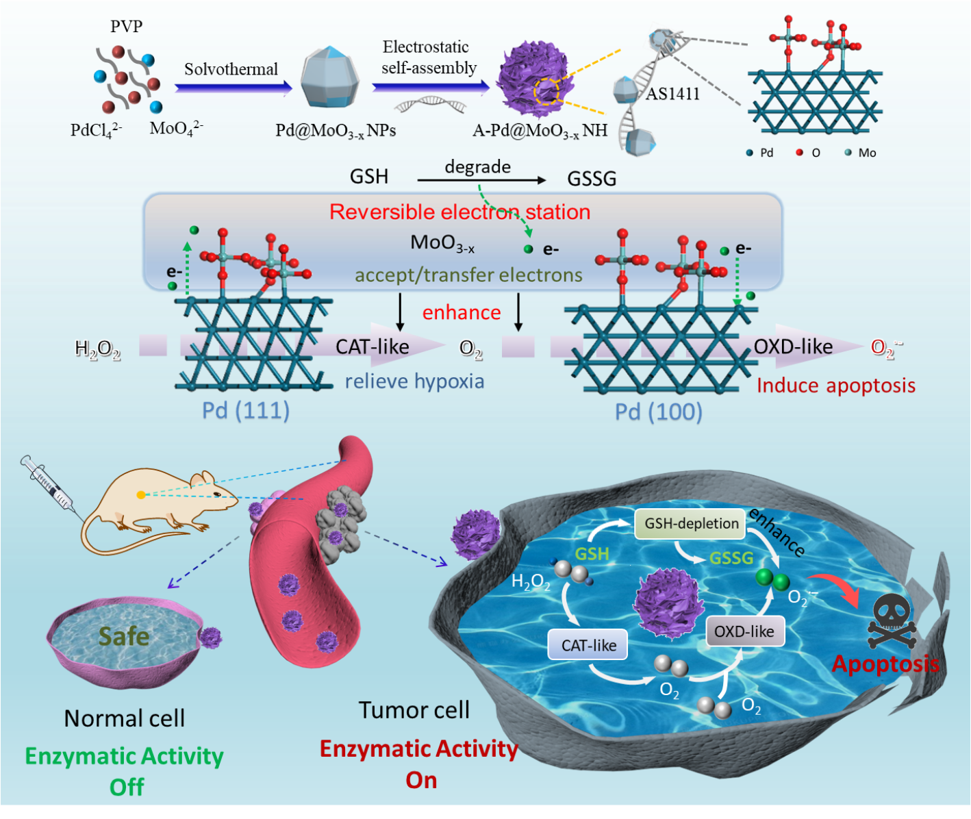 鉴于此,近日琉璃神社 那娜教授课题组构建了一种适配体功能化的Pd@MoO3-x纳米绣球花纳米酶(A-Pd@MoO3-x NH),用于高效肿瘤特异性治疗。利用纳米Pd的不规则形状特性,A-Pd@MoO3-x NH纳米酶同时暴露出具有过氧化氢酶活性的Pd (111)晶面和氧化酶活性的Pd (100)晶面,构成了双活性中心。这可以催化级联酶反应,在克服肿瘤厌氧的同时,进一步富集具有细胞毒性的超氧自由基(O2•−)。基于氧化还原反应,纳米酶能够有效降解消耗O2•−的GSH,避免GSH的负面影响。更重要的是,钼氧化物(MoO3-x)作为可逆电子中转站,通过氧桥和少量的Mo-Pd键,可以接收Pd (111)晶面上的电子,随后转移至Pd (100)晶面上。因此,可以协同提升双活性中心的模拟酶活性以及GSH降解能力,促进O2•−的富集。基于光谱、质谱等多种表征技术,并结合理论计算,有效证明了该双活性位点的巧妙设计,并有效实现了纳米酶的高效级联催化治疗。实验证实,在TME的弱酸性环境中,A-Pd@MoO3-x NH能够选择且高效地杀死肿瘤细胞,并得到良好的治疗效果。