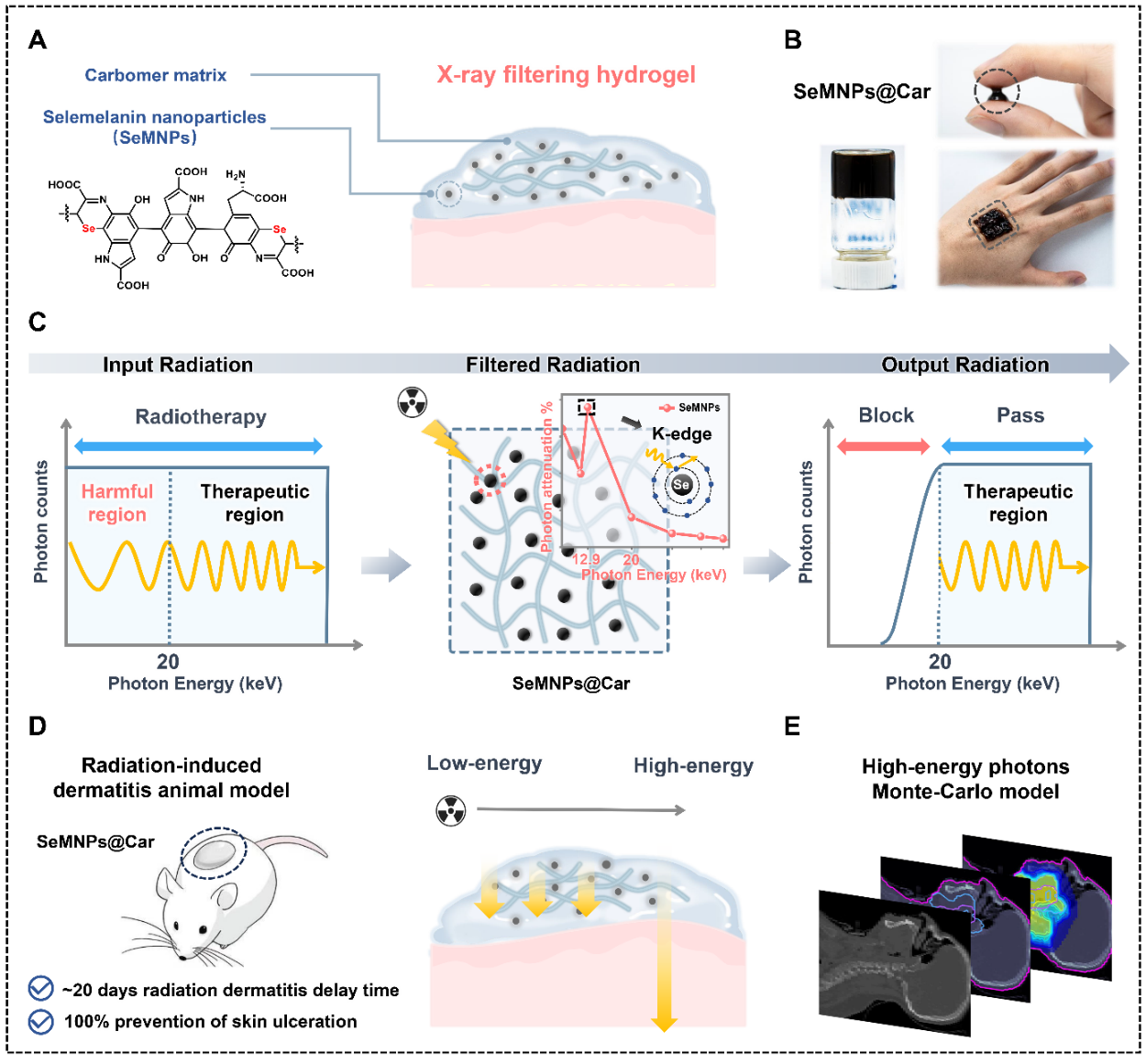 在多方合作下,课题组首次报道了一种X射线过滤的皮肤敷料,将硒黑素纳米颗粒与卡波姆水凝胶结合,巧妙利用硒元素在K-edge近阈值能量光子的强烈吸收,实现了针对放疗射线的能量选择性屏蔽策略,旨在保护正常皮肤组织。该材料对皮肤有害X射线具有高达96% 的屏蔽性,同时保持对高能治疗射线的98%以上的透射率。在动物模型中,实现了100%的溃疡预防和RD发作的最长延迟(~20 天),优于临床 RD 治疗方案。此外,基于蒙特卡洛的放疗场景重建进一步证明了其临床适用性。这项工作将硒元素独特的光电吸收特性融入到水凝胶设计,为减轻RD和其他放疗并发症开辟了新途径,并为开发基于软材料的 X 射线滤光片提供了设计指导。