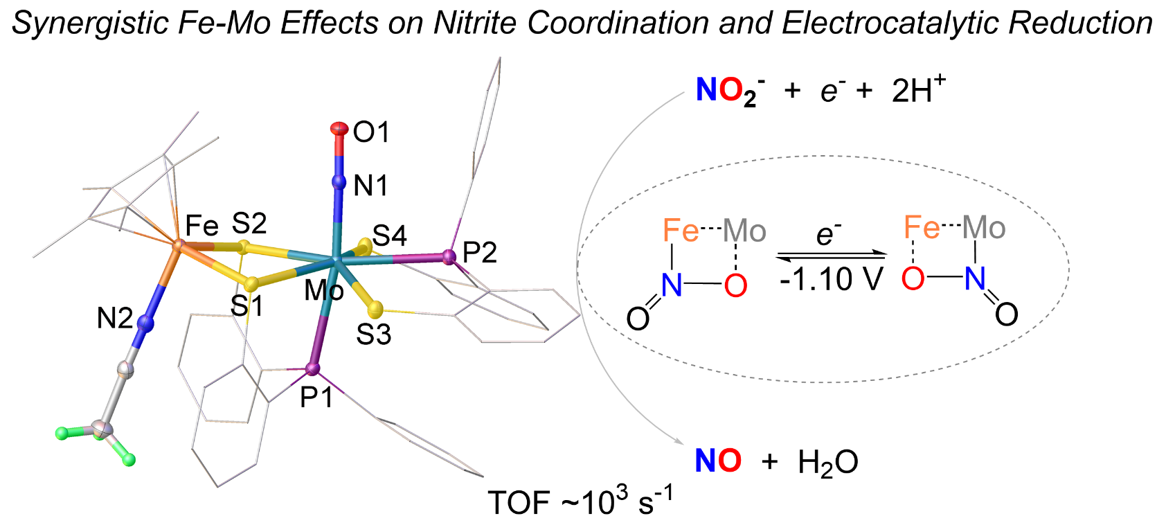 近期,王文光教授课题组联合中山大学叶生发教授、华中科技大学廖荣臻教授课题组,报道了一种Fe(II)Mo(IV) 双金属电催化剂。该催化剂在NO₂⁻还原反应中表现出卓越性能:TOF值高达103 s⁻¹,NO选择性达93.8%,创下单相催化剂最高活性纪录。机理研究表明(图1c),Fe-Mo双中心通过动态配位协同作用,一方面促进N-O键的高效断裂,另一方面通过Mo(IV)捕获NO有效抑制Fe(II)-NO中间体的过度还原,从而实现了电子-质子转移过程的精准调控。这一发现为含氮小分子的高选择性转化提供了新范式。