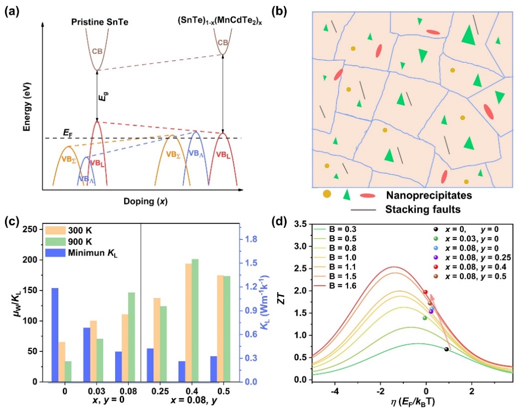 针对上述关键科学问题,琉璃神社 吴立明教授和陈玲教授课题组选取具有双价带电输运特征的SnTe为研究对象,通过MnCdTe2合金化策略激活了SnTe低能量位置的价带,首次实现SnTe体系三价带协同的电输运;进一步通过合理的固溶度调控,细化了析出相尺寸,最终实现热输运与电输运的协同优化。
