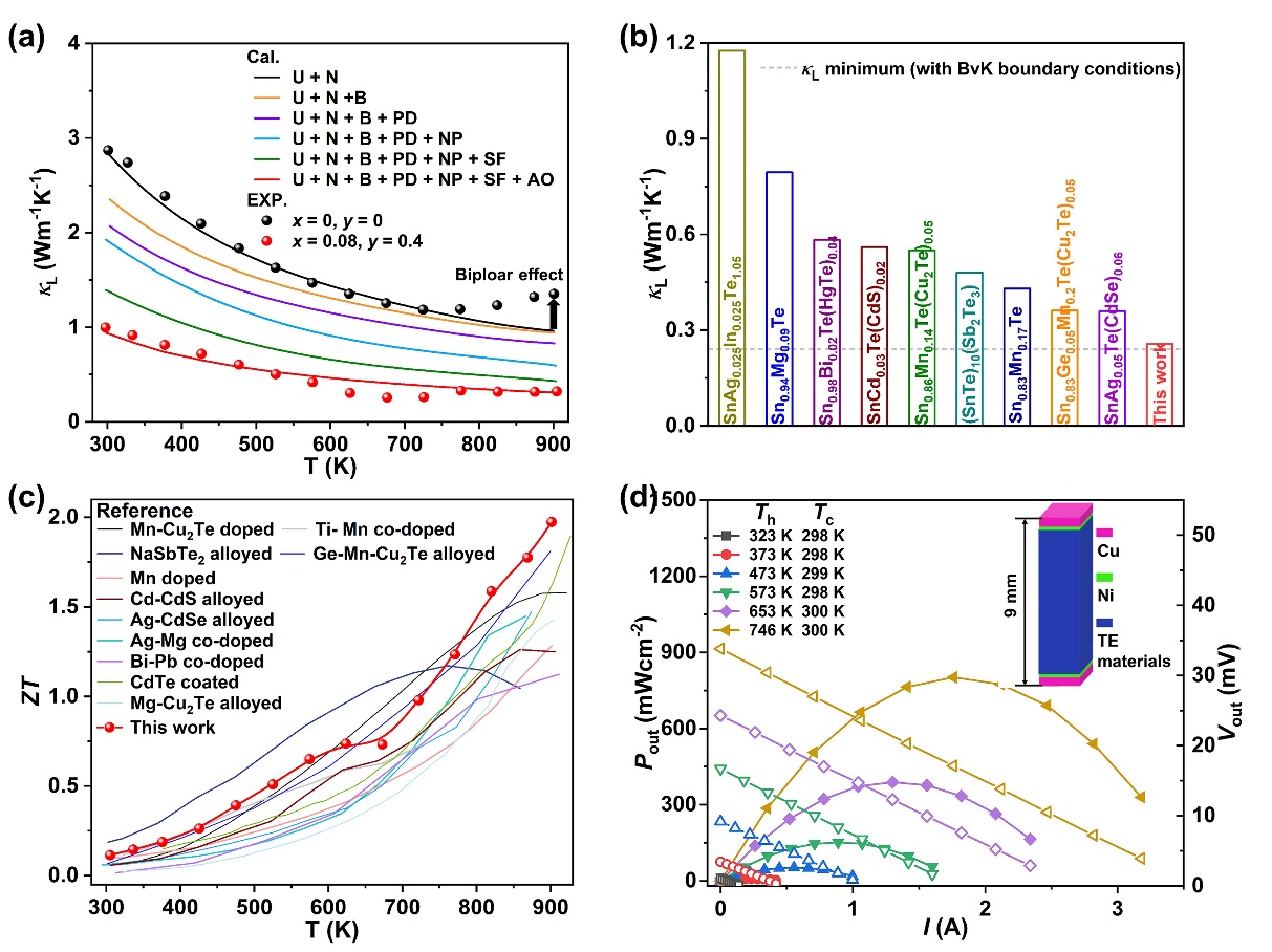 (SnTe)0.92(MnCd0.6Ge0.4Te2)0.08的能带结构得到合理优化,微结构实现精细调控,实现了电输运性能与热输运性能的协同优化,在900 K的ZT值约为1.97,是截止报道时间该体系的最高值。利用材料制作的单壁热电器件在温差446 K时,输出功率密度较高(800 mWcm-2)。
