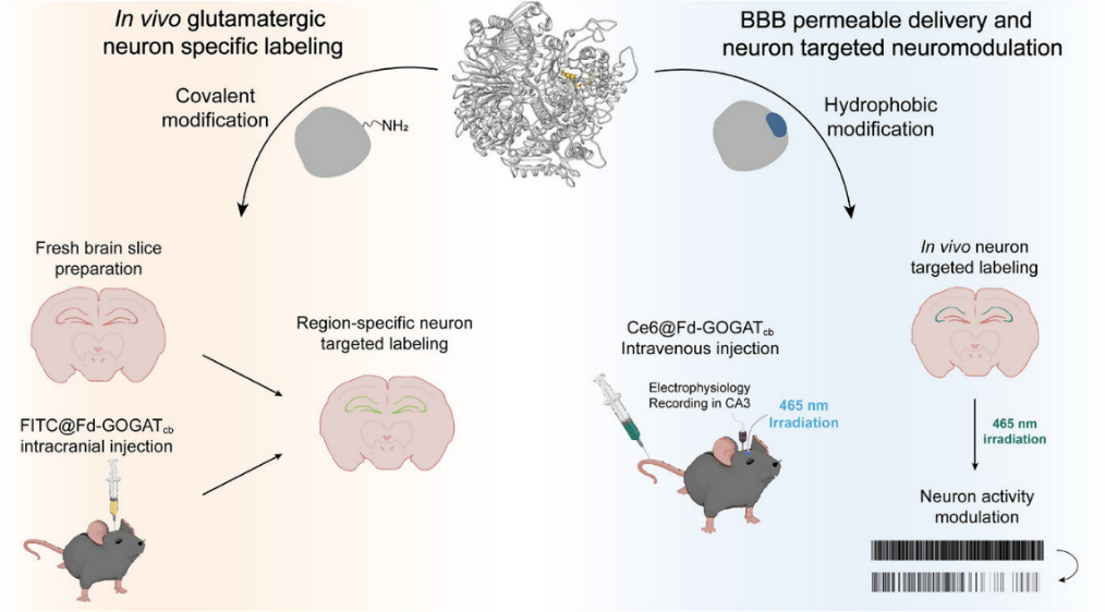近期,课题组利用蓝藻细菌中的铁氧还蛋白依赖型谷氨酸合成酶(Fd-GOGATcb),开发了一种非基因编码、可自主递送、跨血脑屏障的谷氨酸能神经元活体靶向工具。结合蛋白质化学修饰技术,Fd-GOGATcb可构建为一种免转染的多功能蛋白质元件。通过荧光功能化修饰,Fd-GOGATcb可作为谷氨酸能神经元的荧光探针,无需固定即可在原代细胞、脑片及活体多个层次实现谷氨酸能神经元的多尺度快速靶向成像。进一步,Fd-GOGATcb可携带光敏分子,在尾静脉系统给药的条件下主动透过小鼠血脑屏障,实现活体谷氨酸能神经元电活动的光调控。该蛋白元件的构筑为谷氨酸能神经元功能研究提供了新的方法。