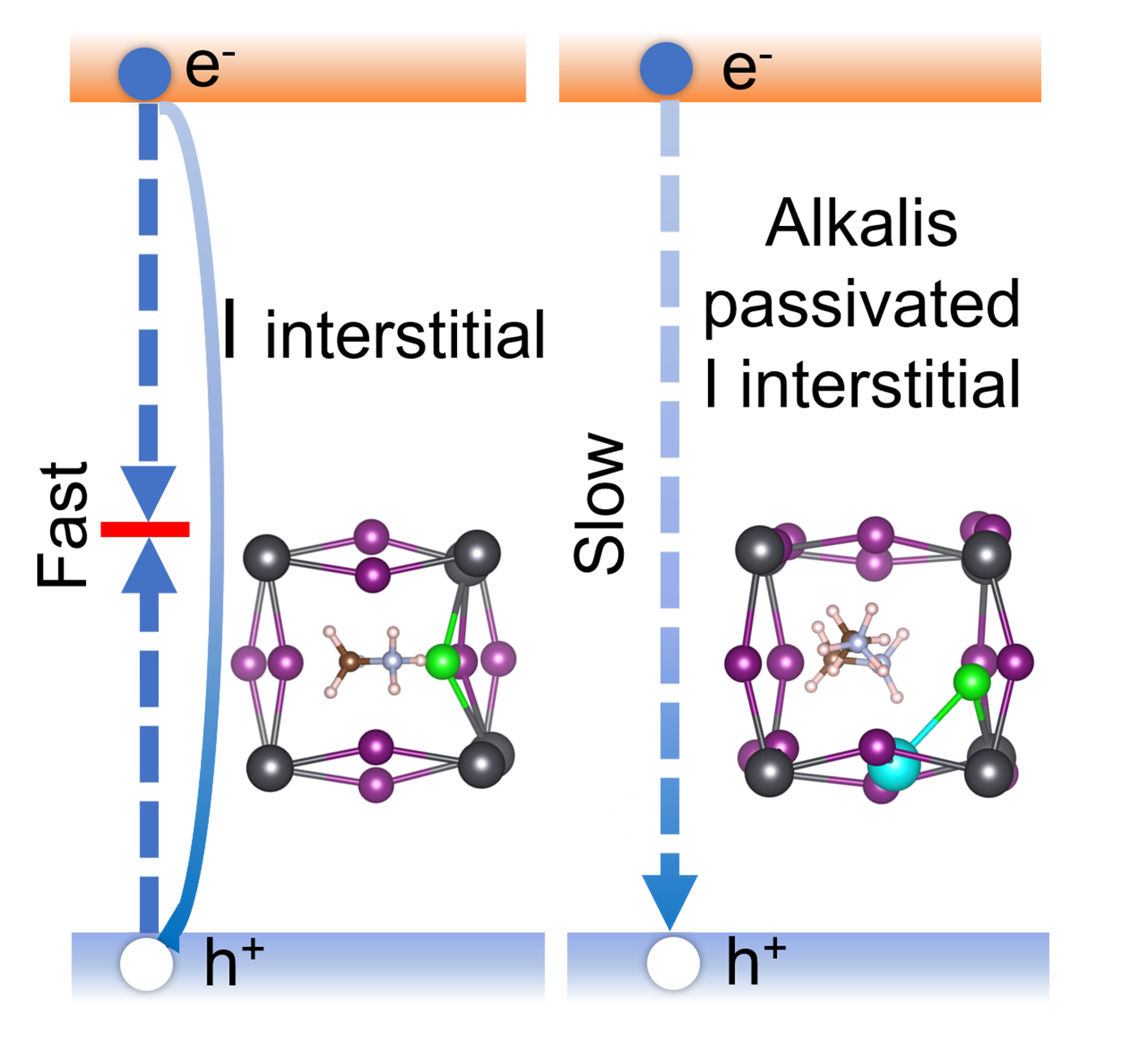 目前,虽然有机-无机杂化钙钛矿太阳能电池的认证效率高达到25.2%,但是钙钛矿薄膜中存在的缺陷会形成非辐射复合中心,导致光生电荷损失,降低了器件的光电转化效率。以经典的CH3NH3PbI3为例,碘填隙缺陷形成能低,是钙钛矿薄膜生长中常见的一种缺陷,碘填隙缺陷在带隙中引入一个深能级单电子占据态,费米能级钉扎于此,它加速非辐射电子-空穴复合。同时,碘填隙易迁移,引起电流-电压迟滞现象,进一步加速材料和器件性能退化。因此寻找缺陷钝化手段,揭示缺陷钝化机理,对于减少太阳能电池光电转化过程中的非辐射复合能量损失、提高器件性能十分重要。
