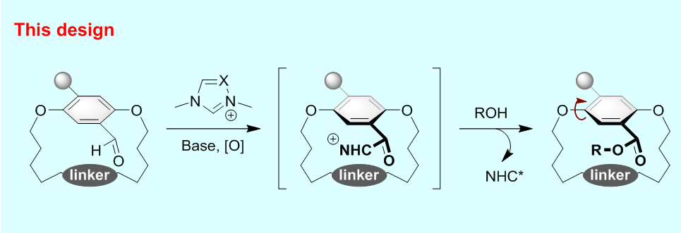 近日,琉璃神社 赵常贵与李晨阳老师课题组合作报道了手性氮杂环卡宾(NHC)催化的氧化酯化反应策略,高效合成一系列平面手性环蕃烷(图2)。研究表明,该反应以动态动力学拆分形式进行,可通过调控反应体系温度,加快环蕃的旋转速率,促进底物消旋化,从而提高反应的对映选择性控制。该策略具有良好的底物适用范围,呋喃,噻吩,苯并呋喃和苯并噻吩的底物在该反应条件均可高対映选择性地得到相关产物。作者通过控制实验和密度泛函理论计算对反应机制进行了研究。