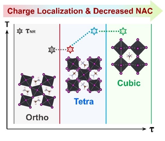 研究表明,热效应驱动有机阳离子由低温有序转化为高温无序,加剧无机晶格形变,导致Pb-I键长和I-Pb-I键角数值随着温度升高而离散分布,尤其是使键角偏离180度,减小了Pb-I轨道重叠,破坏轨道杂化。研究进一步表明,由低温相至高温相,电荷密度分布的局域程度增加,电子-空穴波函数的重叠程度降低,非绝热耦合减小。因此,高温相有利于电子和空穴的有效分离、激子解离和大极化子的形成,进一步减小非绝热耦合。此外,高温激活了有机阳离子的高频振动模式,加速了量子退相干,进一步抑制非辐射电子-空穴复合。