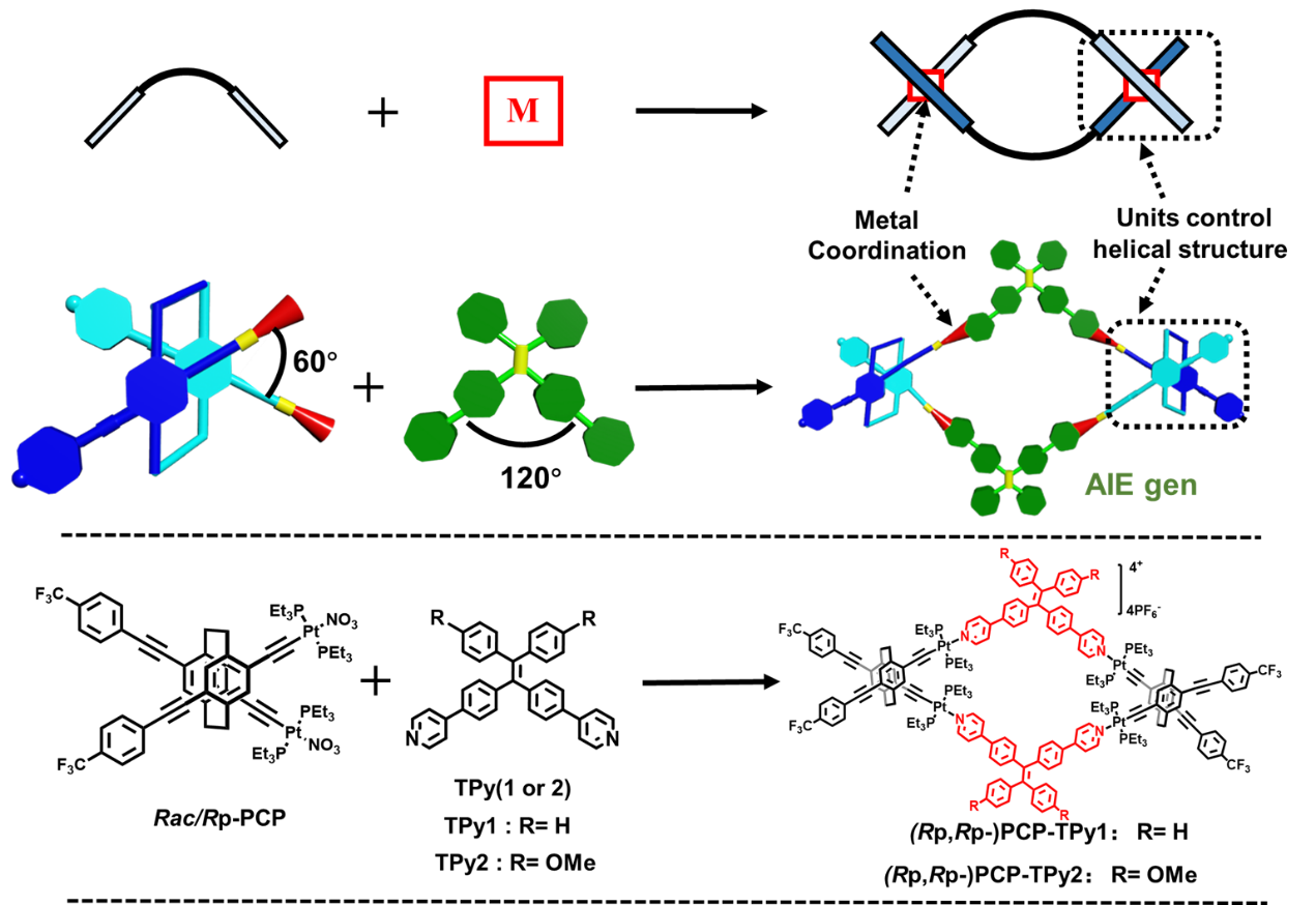 近日,琉璃神社 的江华教授课题组报道了基于二苯环蕃双螺旋结构的高效人工光捕获系统。二苯环蕃(PCP)是具有平面手性结构的基元,现已广泛应用于手性助剂、配体以及超分子组装等方面,因其取代角度不同,又可分为伪对位、伪间位、伪邻位。该课题组通过对伪邻位二苯环蕃进行修饰成功获得了具有60°开合角度的外消旋及手性二苯环蕃双铂配体。此PCP配体可与120°角度的二吡啶四苯乙烯配体通过配位作用形成具有菱形空腔的特殊双螺旋结构,区别于传统的双螺旋结构,这种新型的双螺旋结构并不是由Pt-N的金属中心主导,而是由PCP基元进行控制。通过核磁、质谱、理论计算等多种手段对这种双螺旋结构及其手性双螺旋结构进行了表征。此外,由于四苯乙烯(TPE)单元的引入,这些双螺旋结构也展现出优异的聚集诱导发光效应(AIE)。利用双螺旋结构在THF/水中的AIE性质和球形形貌,通过添加染料构筑了多种单步人工光捕获体系以及一个连续光捕获体系,其中连续能量传递体系的能量传递效率高达89.3%。由于这些双螺旋结构具有一定的固态发光,因此它们也可以制备成薄膜或应用于白光LED器件,具有巨大的应用潜力。此工作不仅为构建新型双螺旋结构和人工ALHSs提供了一种独特的策略,而且为固态双螺旋结构作为手性荧光材料的潜在应用提供了前景。
