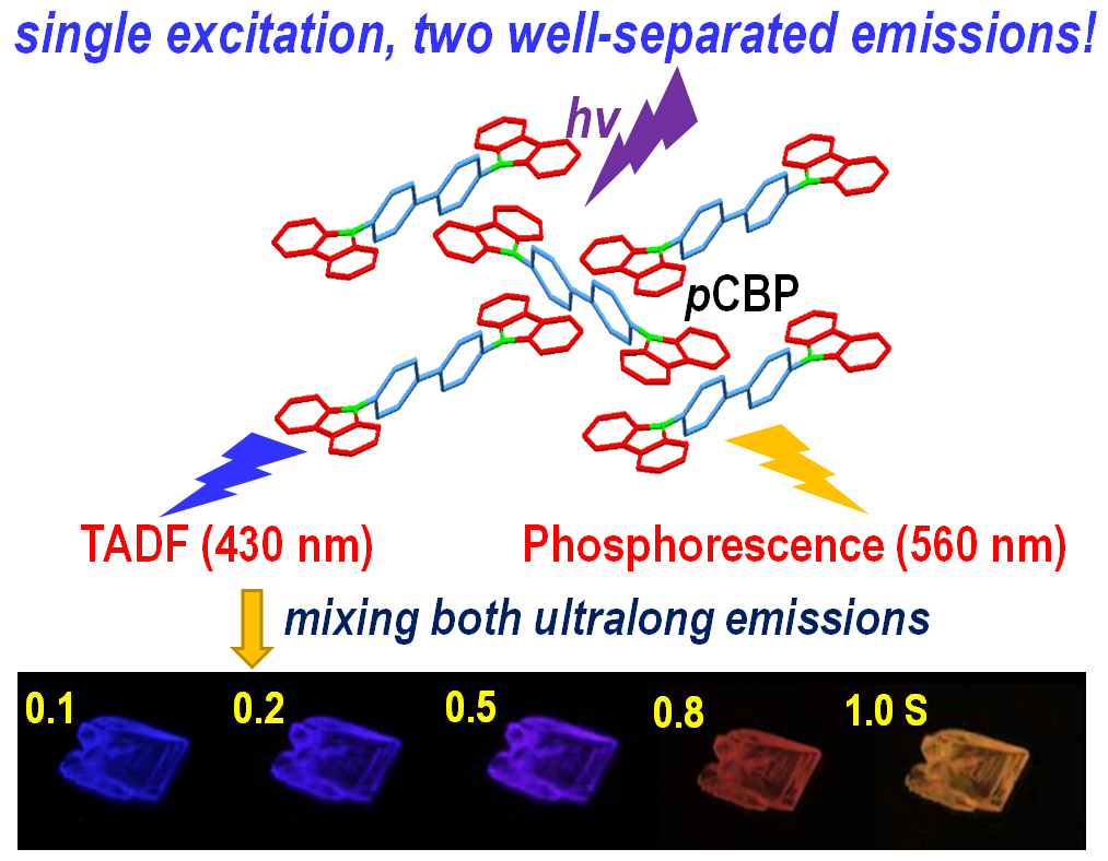 图1: 长余辉颜色随时间变化图和QM(CASPT2)/MM计算得到的pCBP和mCBP晶体的发光机理示意图。