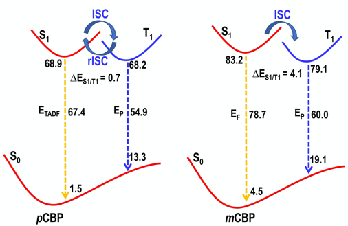 最近,杨清正教授、崔刚龙教授和方维海教授课题组合作报道了基于4,4'-双(9H-咔唑-9-基)联苯晶体(pCBP)的单组分室温有机变色长余辉发光材料。该有机晶体在激发源被移去后的一段时间内,其长余辉颜色随时间呈现出从蓝色到橙色的变化。实验研究表明该奇特的发光特性是由衰减速率不同的蓝光和橙光两个发射峰造成的。发射光谱分析及高精度理论计算表明,蓝光和橙光发射峰分别来自于长寿命的热激活延迟荧光(TADF)和室温磷光(RTP)。超长TADF是由S1与T1间较小的能量差以及从T1到S1缓慢的反向系间窜跃效率引起的。此外,pCBP晶体的TADF和RTP的发光波长显著不同,波峰位于430 nm和560 nm。计算结果表明双发射波长的较大能差主要来自于S1和T1极小结构处S0能量的较大差异(见图1)。