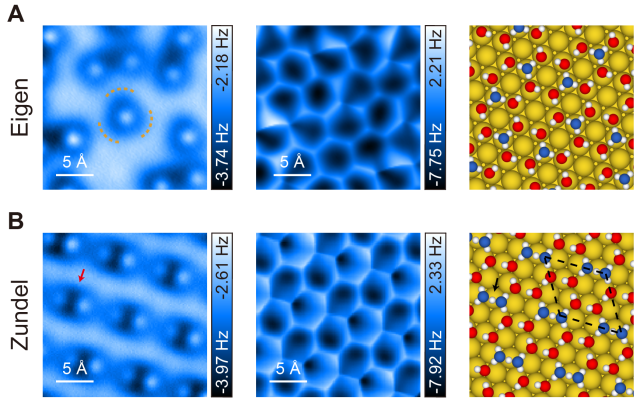 在本工作中,研究人员在不同的金属(Au, Cu, Pt, Ru)表面共沉积氢原子和水分子,氢原子与金属衬底发生电荷转移形成氢离子,氢离子进一步与水分子结合自发形成二维氢键网络。为了能够从实空间区分水分子和水合质子,研究人员在2018年探测到水合钠离子的基础上(Nature 557, 701 (2018)),开发了新一代qPlus型非侵扰式原子力显微镜技术(qPlus-AFM),并将其探测灵敏度和成像分辨率分别提升到~2 皮牛和~20 皮米(国际最好水平),首次“看到”水合质子单体(H3O+)的原子结构以及由Eigen构型水合质子自组装形成的二维六角氢键网络(图2A)。