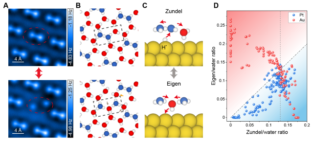 图3 (A-C)针尖操纵Eigen和Zundel构型相互转变的实验图和模型示意图;(D)不同氢离子掺杂浓度下,Au(111)与Pt(111)表面Eigen与Zundel离子浓度的关联。