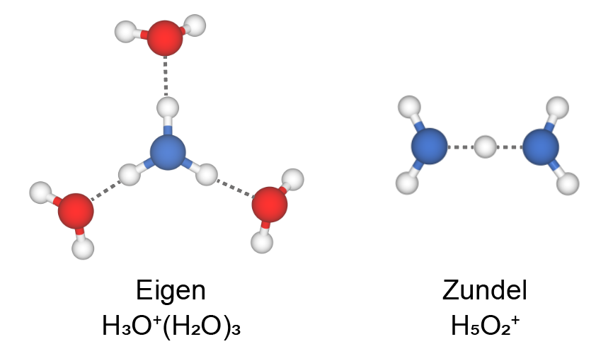 图1 Eigen构型和Zundel构型水合质子的结构模型图。Eigen构型由一个水合质子(H3O+)通过氢键相互作用与三个水分子(H2O)连接而成,该构型只存在普通的、非对称氢键;Zundel构型中氢离子被两个水分子共享,形成对称氢键。