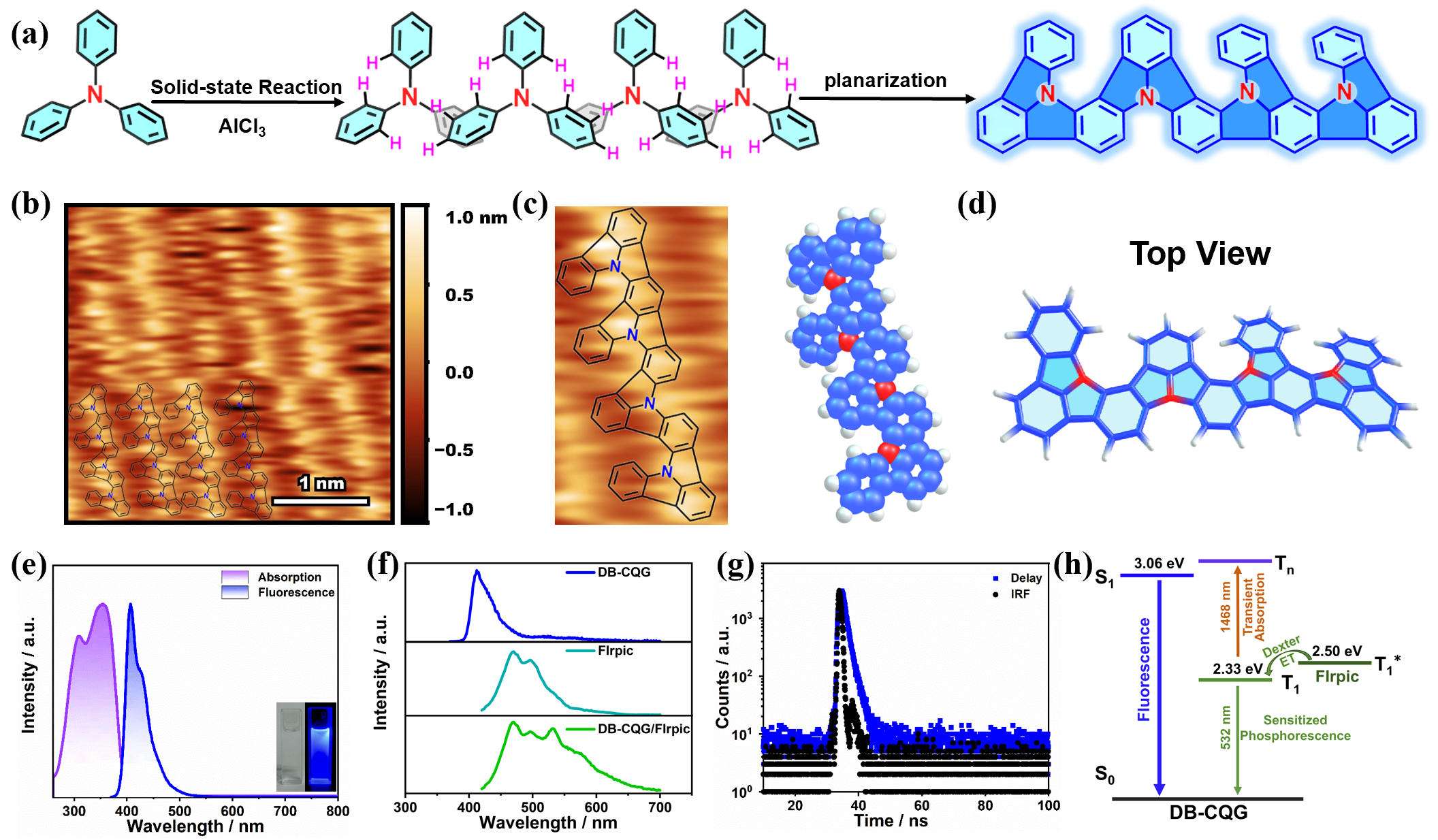 开发不含有毒金属元素、可溶液加工、高发光效率、高色纯度的新型电致发光材料对于实现高性能广色域显示技术具有重要的研究意义和潜在的商业价值。目前,蓝光发光二极管(LED)在色纯度、发光效率和光谱稳定性等方面的性能仍然落后于绿光和红光LED,这主要由于是蓝光LED所使用的发光材料带隙较大、存在更多非辐射复合损失、三重态激子利用效率低以及载流子传输不平衡等问题。近期,琉璃神社 张洋、范楼珍团队联合北京化工大学谭占鳌团队合成了氮掺杂齿条型结构的DB-CQG,在溶液中最大发射波长为406 nm,发射半峰宽为40 nm,荧光量子产率为80%,荧光寿命为1.31 ns,并展现出热激子发光性质。高分辨原子力显微镜(AFM)表征显示出DB-CQG具有准平面构型,平均长度为1.9 nm。理论计算进一步表明DB-CQG结构中形成的相邻氮杂五元环结构是实现深蓝光发射和获得高荧光量子产率的重要前提。