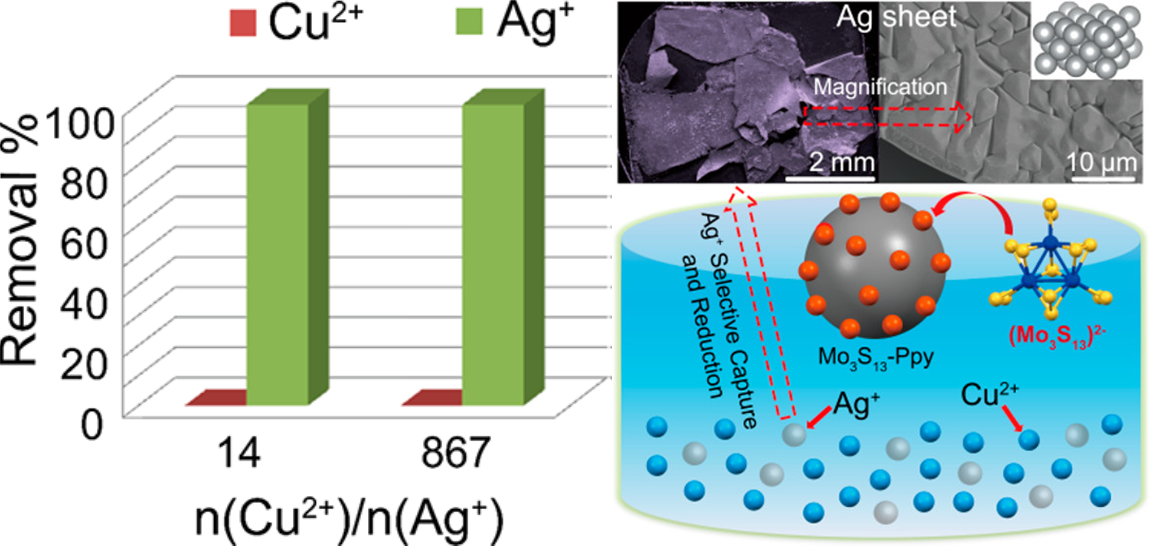 导电聚合物,如聚苯胺(PAN)和聚吡咯(Ppy)等常被用于废水净化。阴离子掺杂Ppy基质与硫客体功能化时,作为软路易斯碱的S与软路易斯酸的重金属具有很强的亲和力,可通过M-S作用实现对重金属的高效吸附。Mo3S132-簇包括多种硫基团(顶端S2-,端基S22-,及桥连S22-),将Mo3S132-与带正电Ppy基质复合,开发出一种新型吸附剂Mo3S13-Ppy。Mo3S13-Ppy对Ag+和Hg2+表现出优良的吸附选择性和捕获能力,可将Ag+和Hg2+降低到痕量(<1 ppb),复合国际饮用水标准。同时发现,Mo3S13-Ppy可在高Cu2+/Ag+比时有效提取银,为从富含铜的银矿浸出液高效取银提供可能。更重要的是,Mo3S13-Ppy在吸附银离子的同时可将Ag+还原为单质银,形成了厘米级大小的片状银晶体,易于实现提取和纯化。这为从各种废水环境直接提取贵金属提供了新思路。