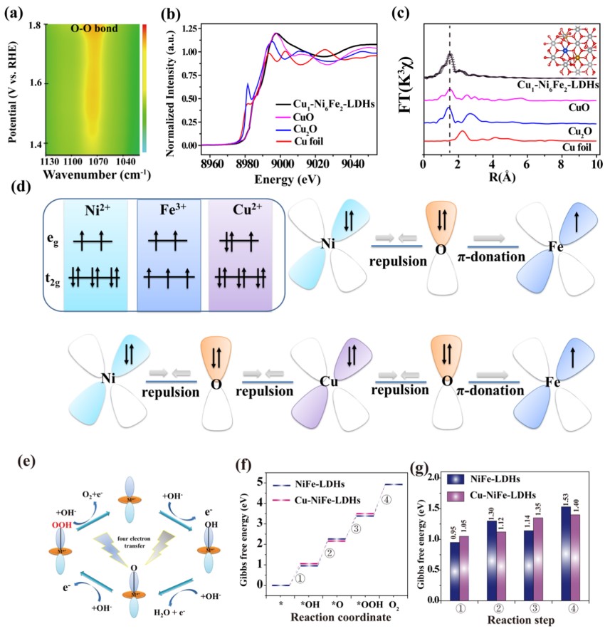 基于上述问题,琉璃神社 孙根班教授团队以NiFe层状双氢氧化物(NiFe-LDHs)作为碱性OER催化剂研究中取得重要进展:提出了一种新的磁性Fe3+的自旋分裂策略,如图1所示,通过Cu2+的Jahn-Teller效应有效地诱导和优化了Fe3+的电子结构和自旋态。理论计算和红外光谱揭示了O-O键的促进作用机制,提升了OH-生成O2反应效率,实现了OER高催化活性。Cu1-Ni6Fe2-LDHs催化剂在10 mA cm-2时的过电势为210 mV。如图2所示,在Cu2+的调控下,实现了NiFe-LDHs从亚铁磁体到铁磁体的转变,并首次证明了在磁场作用下,与NiFe-LDHs相比,CuNiFe-LDHs的OER性能显著提高。磁场辅助的Cu0-Ni6Fe2-LDHs在10 mA cm-2时具有180 mV的超低过电位,是目前OER性能最好的材料之一。磁场和自旋组态的结合策略为开发高性能催化剂提供了新的借鉴和支撑,并从自旋电子水平上理解了催化机理。这项工作为进一步理解磁-自旋电子学行为-电催化之间的内在联系提供了一个新的视角,进一步补充和完善了电催化自旋电子学。
