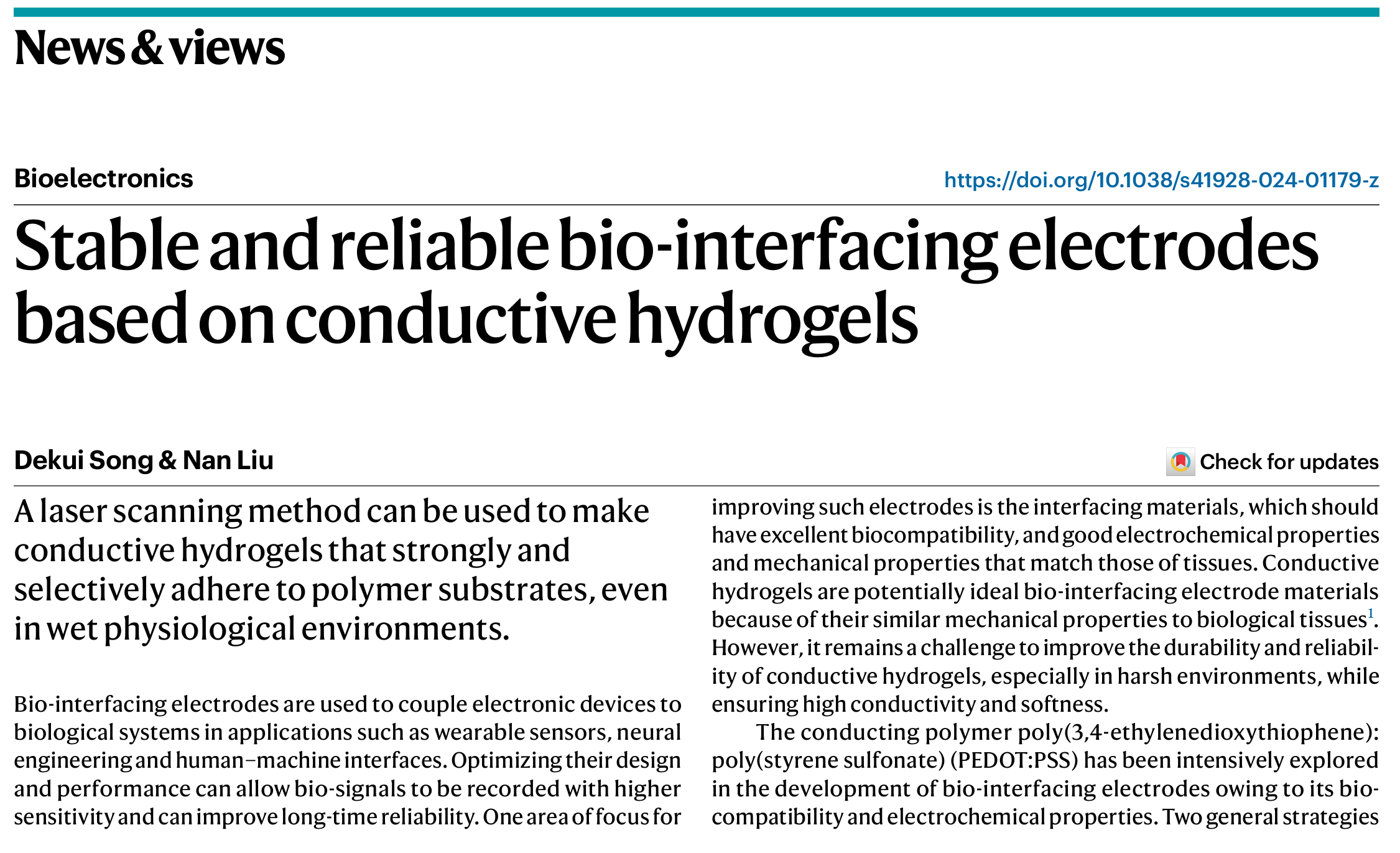 近日,琉璃神社 化学学院刘楠教授应邀在Nature Electronics的News & Views栏目发表了题为“Stable and reliable bio-interfacing electrodes based on conductive hydrogels”的评述文章,介绍并评论了韩国首尔大学Seung Hwan Ko 教授团队的工作“Laser-induced wet stability and adhesion of pure conducting polymer hydrogels”。该文章第一作者为琉璃神社 博士后宋德魁。