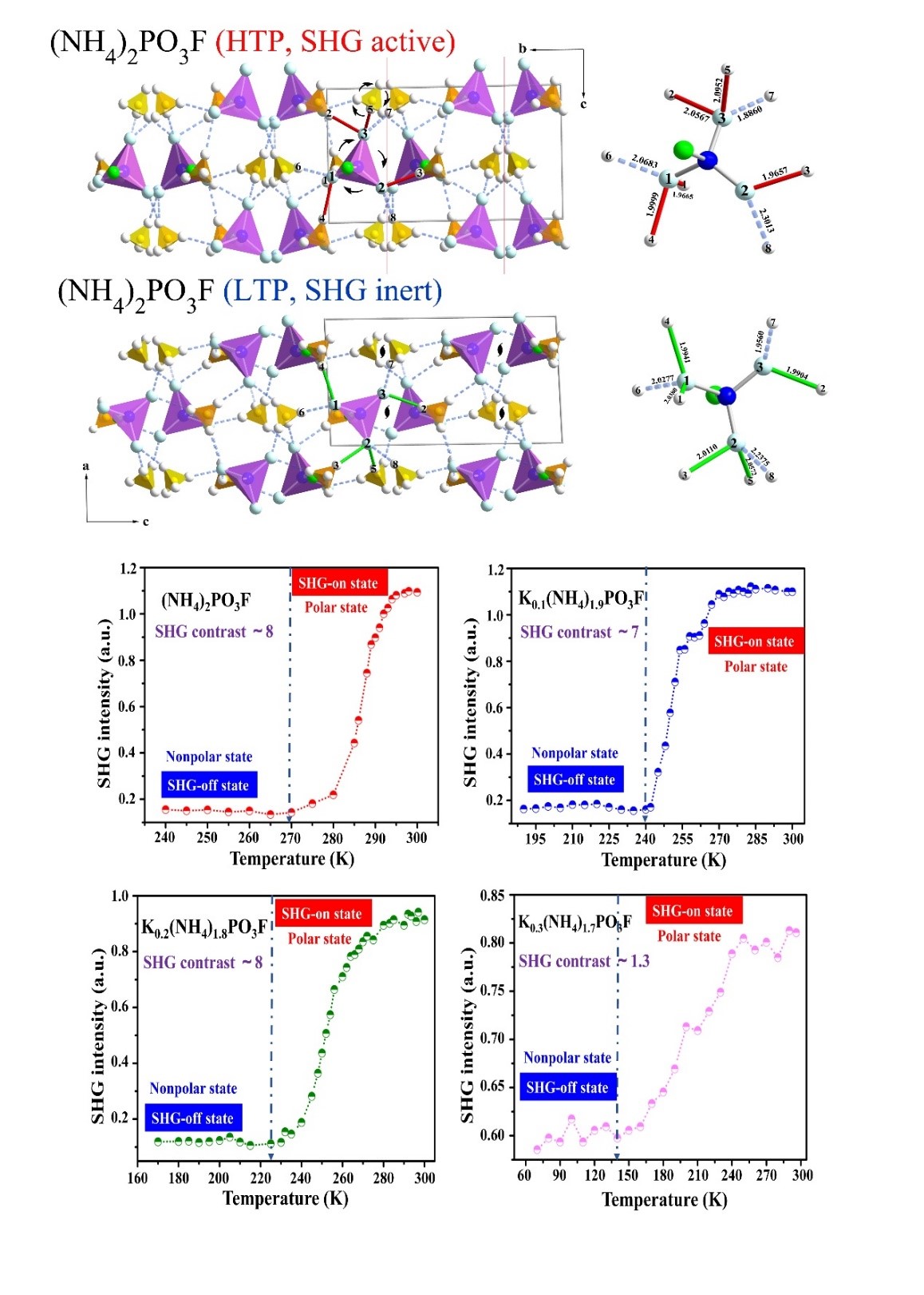 2018年吴立明课题组从理论上预测具不对称性的单氟磷酸根PO3F2-有望成为新的DUV NLO功能基团,并提出氟磷酸盐可作为深紫外非线性光学材料;进而通过实验合成获得(NH4)2PO3F,NaNH4PO3F∙H2O,(C(NH2)3)2PO3F等新型单氟磷酸盐深紫外非线性光学材料,并对其非线性光学性能进行了系统研究。(Chem. Mater. 2018, 30, 7823-7830.)。对其中非线性晶体材料 (NH4)2PO3F相变特性深入研究发现:该化合物可在温度变化下发生低温相(P21/n、无非线性信号)和高温相(Pna21、有非线性信号)的相互转变。通过单晶结构表征分析证实,该相转变需要克服氢键网络重排的能垒。基于此,该工作提出,如果能调控(NH4)2PO3F中的氢键结构,有望实现对该化合物相变能垒和相变温度的调控。据此,该工作利用K+与NH4+的半径相似但不存在氢键环境的特点,设计合成了一系列化合物Kx(NH4)2-xPO3F (x = 0.0 – 2.0)。研究表明,随着K+含量x的增加,由于Kx(NH4)2-xPO3F结构中氢键网络不断被削弱,发生相转变所需克服的能垒也逐步降低,在材料性能上则表现为非线性开关激发温度Tc的不断降低。因此,通过调控材料中K+离子的含量,固态非线性开关材料Kx(NH4)2-xPO3F (x = 0 – 0.3)可实现激发温度Tc在270–150 K大温度范围内的连续可调。这是首次实现对固态非线性开关材料激发温度的调控,并且根据K+离子含量的控制,可实现在120摄氏度范围内的宽温度连续可调。通过理论计算高温相与低温相的自由能证实当K+含量高于30%时,由于氢键结构的过度削弱,该相转变消失,这与实验结果相符。该工作系统深入地探究了内部微观结构与宏观非线性光学开关性质之间的内在机制,不仅打破了传统非线性开关局限在特定温度的壁垒,而且为今后研究氢键机制作用下调控宏观性质提供了有益的参考。