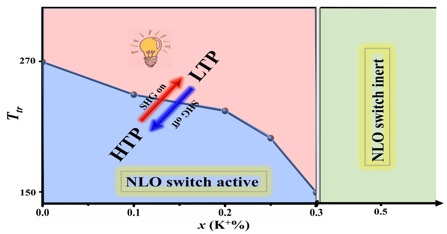 非线性光学开关材料是非线性光学材料的一个重要分支,指的是在某种外界条件(如:光、热、化学环境变化等)变化下,能够在非线性光学 “开”、“关”两种状态间切换的物质。先前的大多数研究主要集中于液态材料,但其易失谐以及不稳定等特点,使得液态开关材料难以获得实际应用。而固态非线性开关材料具备非线性性质优良、性能稳定、易于调控等优势;但是目前具备固态非线性开关特性的材料却还很匮乏,这是因为其不仅要求其结构构筑基元是强响应非线性活性基团,而且环境变化下具备基元间对称性的可逆重排特性。目前,已经报道的固态非线性开关材料在状态间切换依赖于材料本身的相变温度Tc,正因如此,已报道材料只能在一个固定温度点下使用,这严重限制了固态非线性材料在温度响应方面的应用。