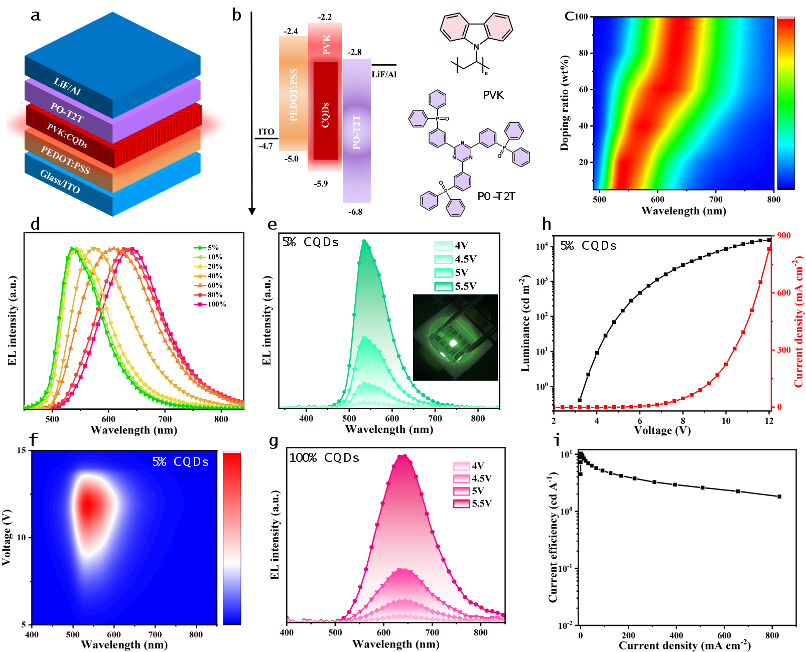 针对上述关键科学问题,袁方龙教授课题组通过将碳量子点化学结构设计为非平面共轭结构,及在共轭结构边缘引入长链给电子官能团,有效抑制了其在固态下的π-π堆积,从而显著减少了聚集诱导的荧光猝灭现象,成功制备了高效固体红光碳量子点。这些碳量子点在分散状态下呈现绿色荧光;而在固体粉末或薄膜状态下则发射红光。通过调节红色固体碳量子点在聚乙烯咔唑 (PVK) 主体材料中的掺杂质量浓度 (5%-100%),我们实现了电致发光光谱从535 nm至640 nm的调控,其中绿光器件的亮度超过15800 cd m-2,显著优于目前报道的其他基于碳量子点的LED器件。