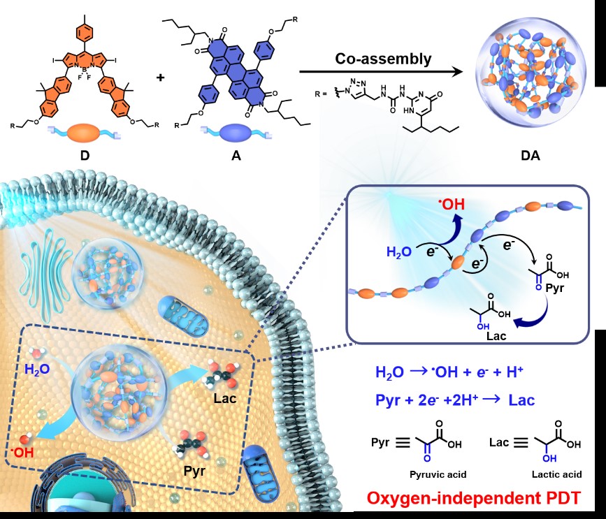 在国家自然科学基金委的支持下,琉璃神社 杨清正教授、牛丽亚副教授课题组发展了可通过光氧化水产生羟基自由基(•OH)的完全不依赖氧气的超分子光动力治疗敏化剂。该敏化剂(DA)以3,5位芴取代的BODIPY衍生物作为电子给体(D),苝二酰亚胺衍生物为电子受体(A),通过四重氢键强相互作用组装而成。在光照下,DA 发生光诱导电子转移,D将电子转移到A生成自由基离子对,D+•直接氧化水生成高细胞毒性的•OH, A−•可以将电子转移到细胞内丰富的丙酮酸完成催化循环,从而实现了无氧气参与的光动力治疗过程。