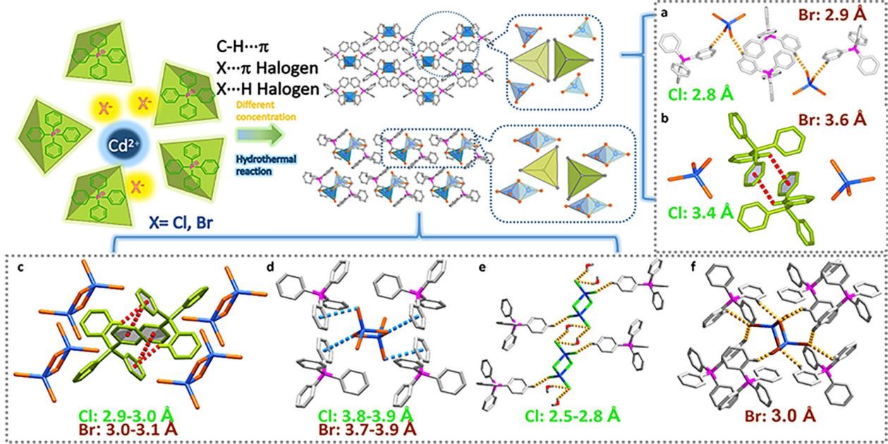 图1. (a,b) (Ph4P)2CdX4和(c,d) (Ph4P)2Cd2X6,显示了氢键以及C-H···π,以及(Ph4P)2Cd2Cl6和(Ph4P)2Cd2Br6内的X···π相互作用。