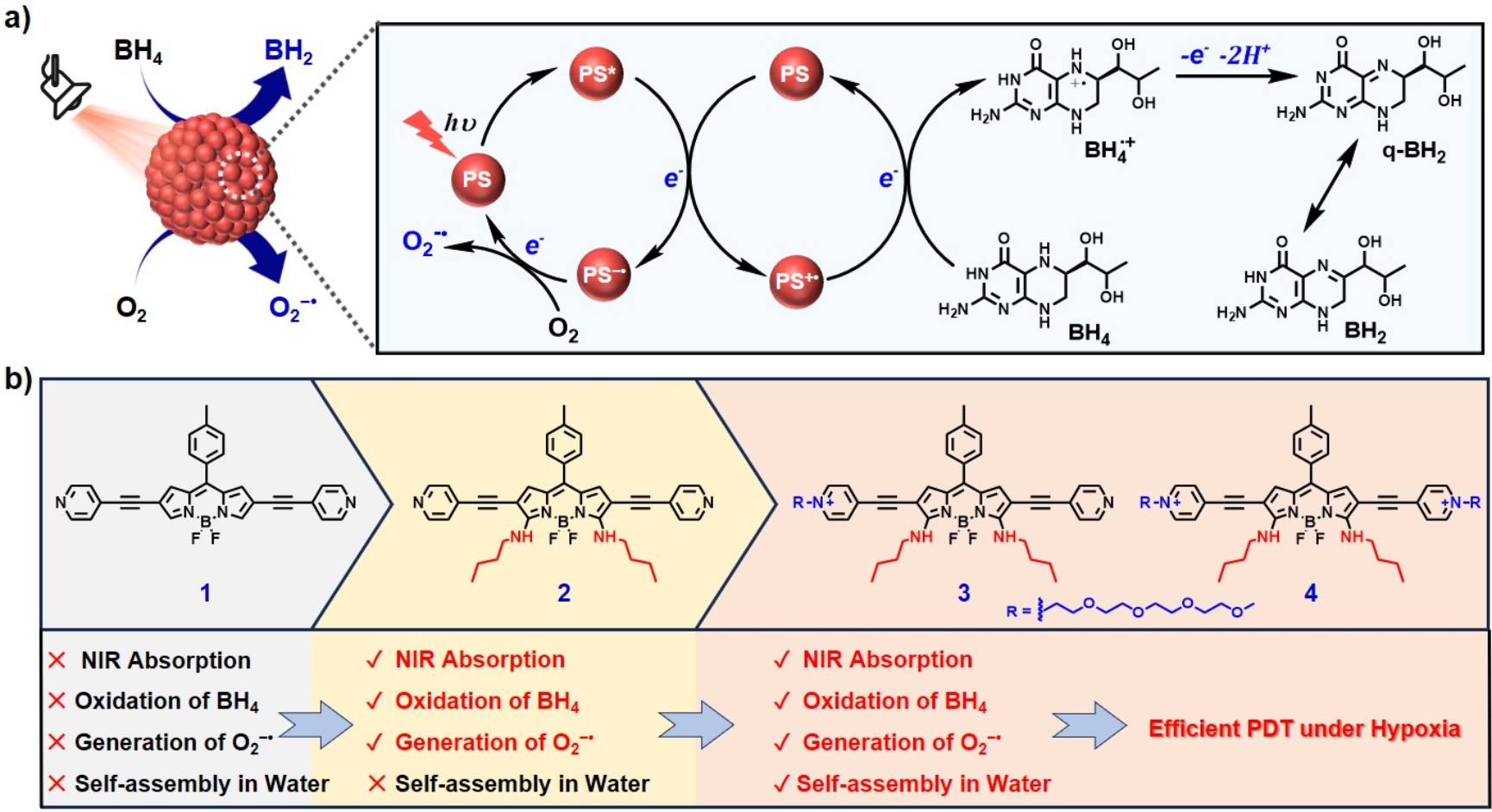 肿瘤乏氧是制约光动力治疗(PDT)疗效的重要因素。研究表明,通过电子/质子转移同时氧化生物分子和生成活性氧自由基的I-型敏化剂具有乏氧耐受性,在低氧浓度下仍能保持治疗效果。设计制备I-型敏化剂已成为光动力治疗研究的重要和热点方向。
