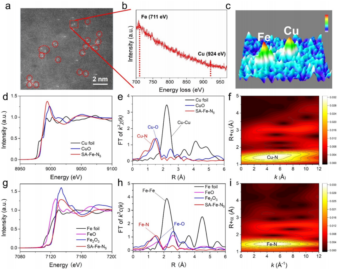 基于此,琉璃神社 孙根班教授团队开发了一种CuN5单原子纳米酶(SAzyme)辅助的Fe-N5催化剂,通过铜-铁双原子位点协同作用显著提升ORR性能。研究结果表明,SA-Fe-N5在碱性电解质中展现出优异的ORR活性,其半波电位(E1/2)和扩散极限电流密度(Jk)与商业Pt/C相当。如图1所示,通过DFT计算揭示了Cu-N5单原子纳米酶对Fe单原子催化剂体系的协同优化机制:(1)Cu作为电子供体通过碳骨架提升Fe位点电子密度,优化ORR中间体吸附能垒,从而提高ORR催化活性;(2)Cu-N5位点作为类过氧化氢酶优先分解H₂O₂,有效抑制Fe引发的芬顿反应,进一步提高ORR催化稳定性。如图2所示,通过配体-介导法成功合成Fe/Cu双原子催化剂,通过EXAFS拟合确认Cu-N5和Fe-N5的配位构型,最终确定Fe-N5/Cu-N5双原子位点。如图3所示,优化后的SA-Fe-N5在碱性电解质中中达到0.89 V(vs. RHE)的半波电位,其性能超越传统商用Pt/C和Fe-N5。关键创新在于引入Cu位点有效抑制Fe位点的类芬顿效应,使羟基自由基(·OH)生成量降低。电化学稳定性结果表明,SA-Fe-N5催化剂经10000次循环后半波电位衰减仅7.2 mV,显著优于Fe-N₅(34 mV)。作为锌-空气电池阴极催化剂,SA-Fe-N5实现了217.8 mW cm-²的峰值功率密度和808.7 mAh g-1的比容量,在10 mA cm⁻²下稳定循环110小时,展现其商业化应用潜力。本研究将理论研究与实验验证相结合,为进一步设计高耐久、低成本ORR电催化剂提供了创新策略和新的视角。