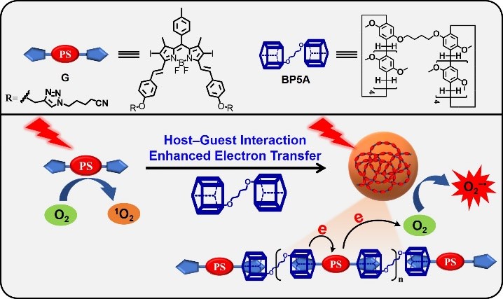基于上述背景,本文提出了通过主客体作用增强电子转移的超分子策略,有效地将传统的II型光敏剂转变为I型光敏剂。以传统的可通过II型PDT机制生成单线态氧的碘代BODIPY(G)衍生物作为客体分子,富电子的双柱[5]芳烃(BP5A)作为大环主体和电子给体,制备了超分子聚合物光敏剂(HG)。主客体相互作用拉近了BODIPY与柱芳烃的距离,从而增强了柱芳烃到BODIPY的电子转移,进一步和分子氧作用通过I型机制生成O2−• (图1),即使在乏氧条件下,也可以有效杀灭肿瘤细胞。利用主客体作用成功地将II型光敏剂转换为I型光敏剂,实现了对I型机制和II型机制的有效调控。