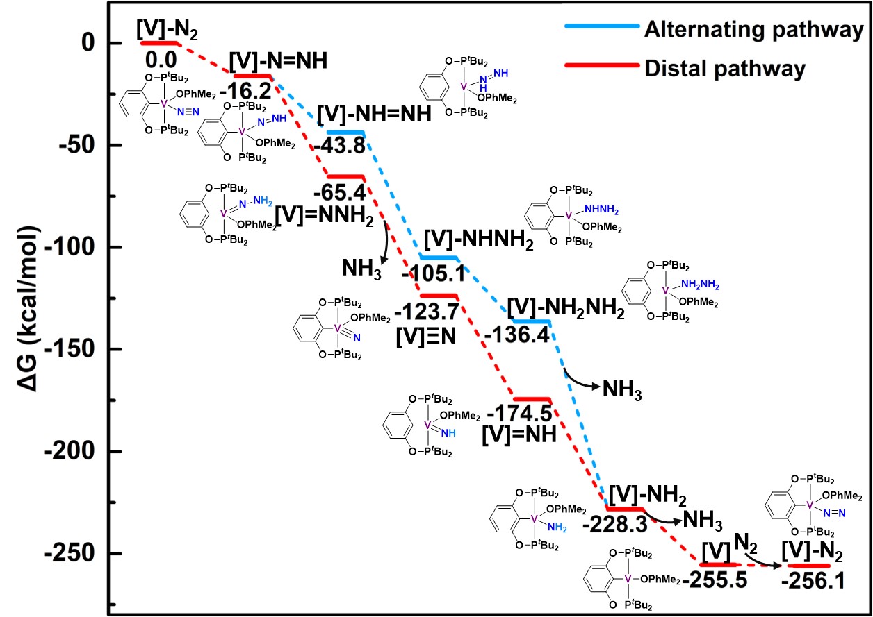 近日,琉璃神社 胡少伟教授和崔刚龙教授课题组合作,通过理论计算和实验研究相结合的方式报道了钒金属配合物催化氮气还原为氨气,并首次从氮气活化体系分离和表征了中性酰肼配合物中间体([V]=NNH2),通过钒的氨基配合物([V]NH2)还原质子化反应得到双氮化合物和释放氨气模拟了催化循环转化过程,结合理论计算阐明了在该催化体系中氮气可能经过端位反应途径(distal pathway)转化为氨气。研究表明,带有POCOP和芳氧基辅助配体的钒配合物作为一个独特的系统可稳定活性含氮物种(NxHy)并促进N2-to-NH3的催化转化,从而为理解生物固氮,特别是对于目前研究较少的铁钒固氮酶的机理提供了更多的视角,为设计出更为高效的合成氨催化剂提供了新的思路。