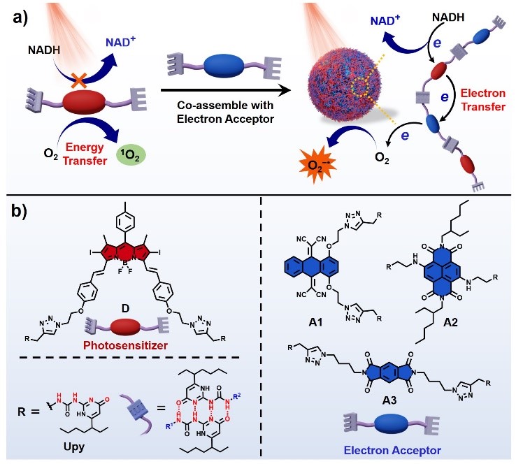 本文是在作者前期工作的基础上,提出了一种全新的I型光敏剂的制备策略,利用超分子共组装的方式在传统II型光敏剂的周围引入电子受体,促进电子转移,不仅可以有效地将传统的II型光敏剂转变为I型光敏剂,高效生成超氧阴离子自由基,而且还可以生成强氧化性的光敏剂阳离子自由基,直接氧化生物分子,加剧生物损伤,提升PDT疗效。作者设计合成了经典的基于BODIPY的II型光敏剂和三类电子受体分子,通过四重氢键作用将光敏剂与电子受体共组装形成超分子共聚物纳米光敏剂。光敏剂分子与电子受体被拉近的分子间距离以及相匹配的氧化还原电位促进了光敏剂到电子受体的光诱导电子转移,并进一步将电子转移到分子氧生成超氧自由基。此外,这一过程伴有强氧化性的光敏剂阳离子自由基的生成,其能够有效氧化活细胞中的NADH,加剧生物损伤。体内外抗肿瘤研究表明,该类超分子光敏剂即使在肿瘤细胞的缺氧环境下也表现出优异的PDT性能,在动物模型中具有明显的实体肿瘤消融效果。这是首次利用引入电子受体成功制备I型光敏剂,是对光动力治疗机制的有效补充。
