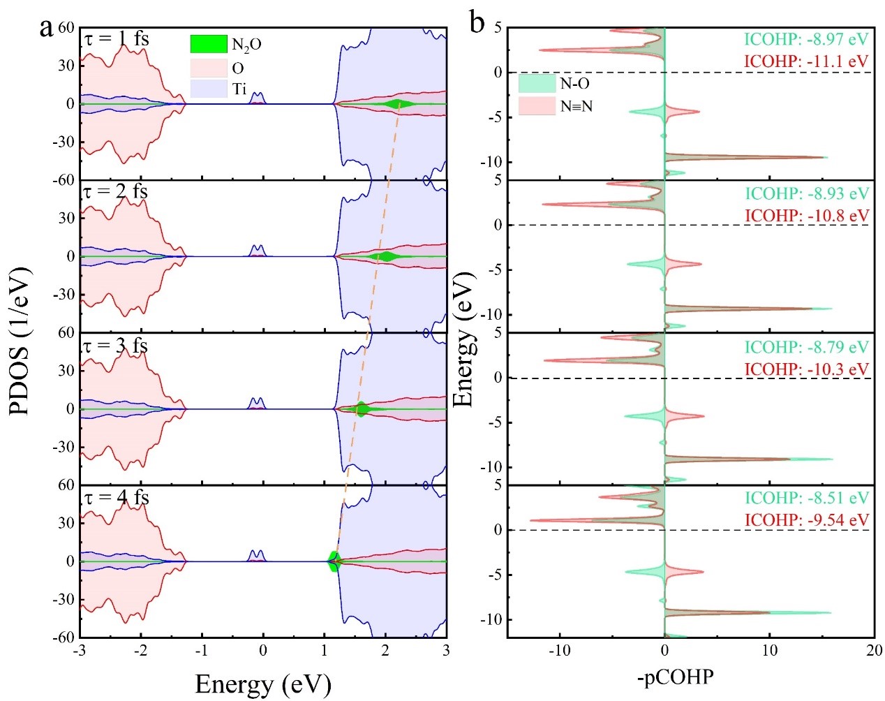 图3. 不同N2O-共振寿命的态密度及化学键强度分析。