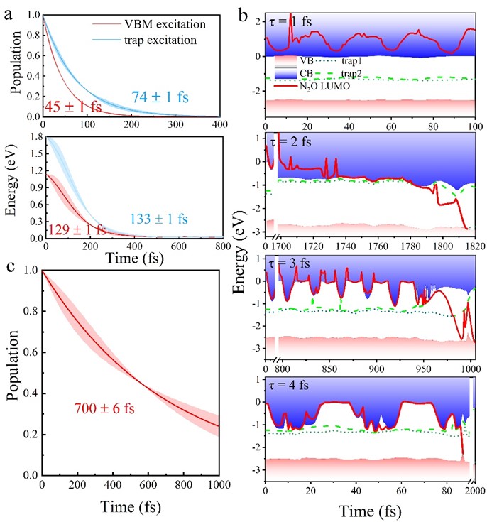 静态电子结构计算和AIMD模拟给出的初步结果激励了随后的非绝热动力学模拟,用以分析N2O-阴离子的形成时间(N2O俘获TiO2导带电子时间)和存活时间(电子-空穴复合时间),从而确定N2O分子是否能够真正分解及分解的机理为何。依据实验,我们考虑了TiO2的带边激发和从靠近导带底的小极化子态(trap2)的激发,图4a显示N2O LUMO俘获TiO2导带电子的时间尺度分别为45fs和74 fs(N2O-阴离子的形成时间),而对应的能量弛豫时间为129和133 fs,大约是电子转移的2倍,表明光激发电子可以有效地被N2O分子有效提取。时间演化的N2O LUMO如图4b所示,当 = 1 fs,N2O LUMO一直位于TiO2导带内,并发生周期性的振荡。当 = 2- fs时,N2O LUMO在初始时刻发生振荡,但在获得足够的局部晶格热能后N2O LUMO逐渐转移至TiO2导带底,随后接受TiO2导带光激发的热电子形成新的N2O-阴离子,紧接着经过约50 fs的热活化使得分子发生解离。非绝热分子动力学模拟计算了新形成的N2O-阴离子上电子与空穴(trap2)的复合时间大约为700 fs,远大于新形成的N2O-稳定在TiO2导带底并发生解离需要的时间(~70 fs),表明光热协助解离可以有效地发生。