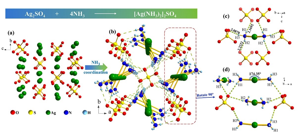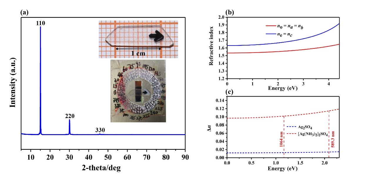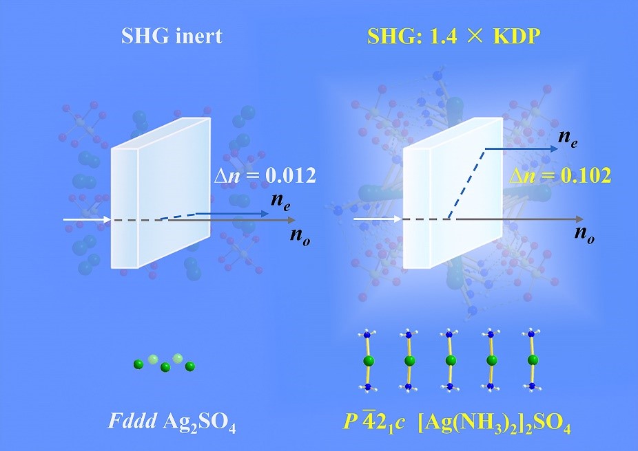 近期,琉璃神社 吴立明、陈玲教授课题组提出了一种阳离子的配位策略,实现了材料的非线性和线性光学性能提升。在该工作中,他们通过引入中性配体NH3对 Ag+ 进行配位,驱动了Ag2SO4结构从中心对称Fddd空间群向非中心对称四方P421c结构的转变,使得该体系从非线性光学惰性到非线性光学活性的转变。同时与Ag2SO4相比较(∆ncal = 0.012 @ 1064 nm),[Ag(NH3)2]2SO4晶体呈现出显著的双折射率提升(∆nexp = 0.08 @589.3 nm,计算值∆ncal. = 0.102 @ 1064 nm)。理论研究证明,[Ag(NH3)2]2SO4晶体的大双折射率特性主要来源于配位后的特殊的阳离子次结构。由于[Ag(NH3)2]+的两个配体NH3沿c轴方向形成一个N-Ag-N夹角,这使得阳离子次结构沿c轴产生了一个0.12 D的偶极,而化合物在ab平面上的偶极为零。由于该偶极可与入射光振荡电磁波产生相互作用,使得电磁波的运动在c轴方向被迟滞,从而导致该材料具有大双折射率的光学各向异性。另外,[Ag(NH3)2]2SO4表现出较大的相位匹配的SHG强度(1.4 × KDP @1064 nm),DFT理论计算表明,[Ag(NH3)2]2SO4的SHG响应由阳离子[Ag(NH3)2]+和阴离子SO42-共同贡献。上述研究结果表明在该材料中阳离子对NLO相关性能具有主要的贡献,因此该报道提出的阳离子的配位结构修饰策略,将为非线性光学材料的设计和性能提升提供新的思路。