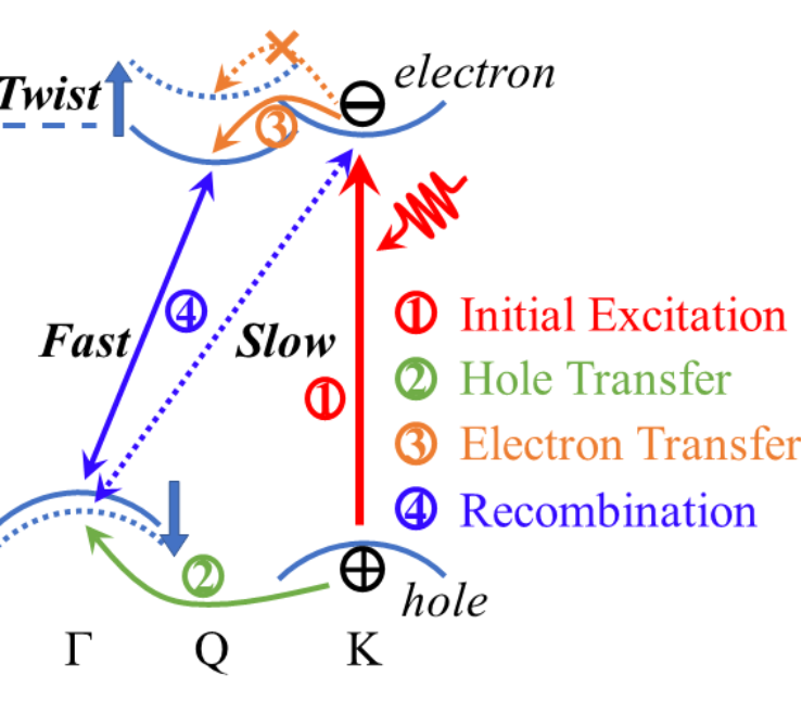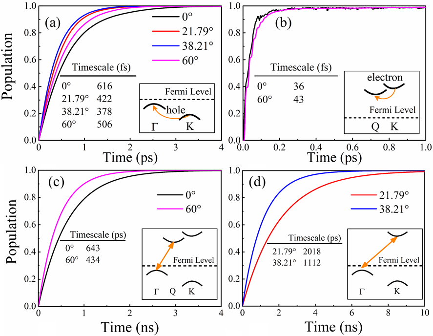 扭曲结构中S原子之间的排斥力削弱了层间耦合,增加了层间距离,并软化了层呼吸模式。扭曲对 K 谷的影响较小,但会降低 Γ 谷并升高 Q 谷,因为它们的波函数在层之间离域。因此,K 谷和 Γ 谷之间能隙的减小加速了扭曲结构中的空穴传输。谷间电子转移比空穴转移快近一个数量级。K 处的波函数比 Q 值更局域化,并且带隙更大,导致层间复合的非绝热耦合更小,使其在扭曲结构中比高对称结构慢 3-4 倍。具体载流子动力学如图3所示:初始激发后,载流子与层间呼吸振动(B2g)、W-S键的外面振动(A1g)和面内振动(E2g)耦合,驱动空穴在400-600 fs内从K能谷转移至Γ能谷(图1a),扭转系统表现出更快的转移(378和422fs);而电子转移只发生在高对称0°和60°结构中,时间约为30-40 fs(图2b)。高对称结构的载流子寿命在440-640 ps(图2c),而扭转系统的谷间复合时间在1-2 ns左右(图2d),这有利于光电器件性能的提高。