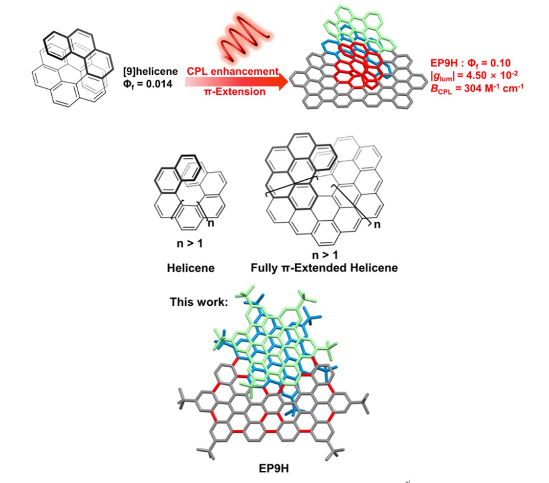 综上所述,我们报道了一种具有十五苯并[9]螺旋烯核心片段的手性纳米石墨烯EP9H。与[9]螺旋烯相比,EP9H具有垂直于螺旋轴的π-体系的扩展。结构变化导致近红外区发射波长发生明显红移。此外,结构扩展显著提高了荧光量子产率和CPL性能。这些结果表明,沿螺旋轴和垂直螺旋轴的π体系扩展是获得增强CPL分子发射器的一种策略。
