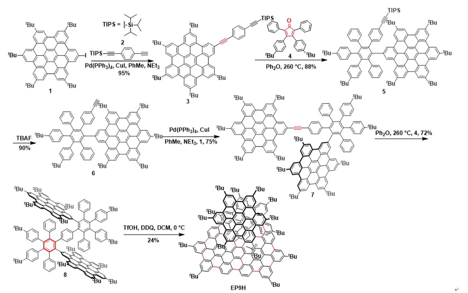 最近,龚汉元教授课题组,通过Sonogashira-Coupling, Diels-Alder 和Scholl 反应,成功构建了一种新的手性纳米石墨烯EP9H,其包含了十五苯并[9]螺烯核心单元,由四个融合的HBC单元组成。