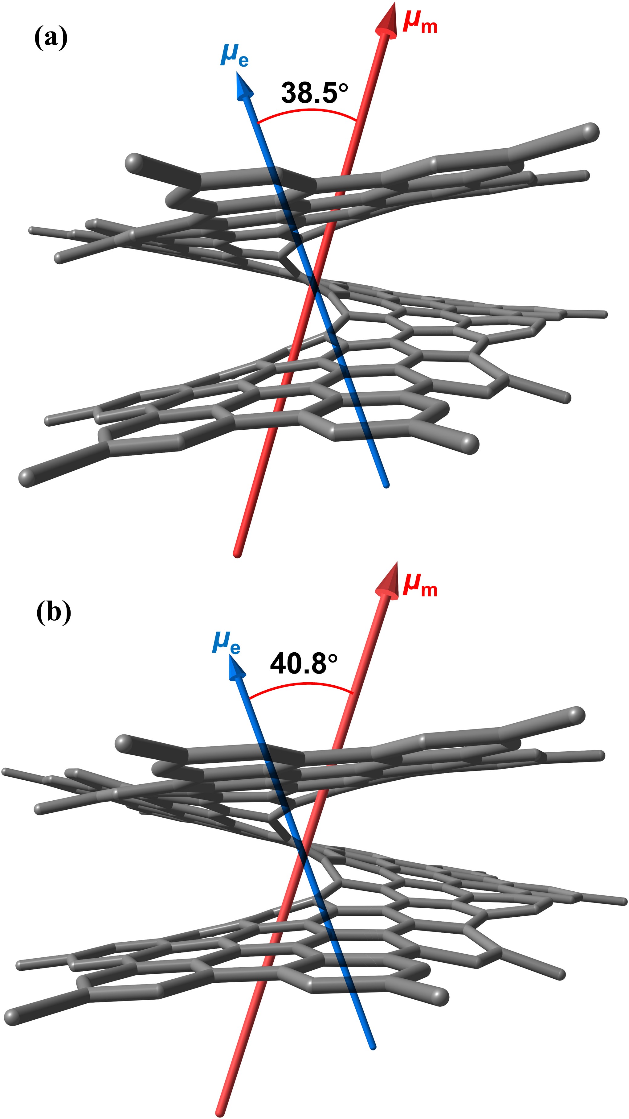 TD-DFT理论计算结果也很好的支持了gabs和glum的实验数据。基于理论计算结果得到的跃迁磁偶极矩和电偶极矩,根据方程g = 4|μm|·|μe|·cosθ / (|μm|2 + |μe|2),计算得到gabs = 4.1 × 10-2 和glum = 3.7 × 10-2。两个偶极矩间较小的夹角(40°)和较大的μm|/|μe|比值(约0.012) 揭示了EP9H具备高g值的理论依据。