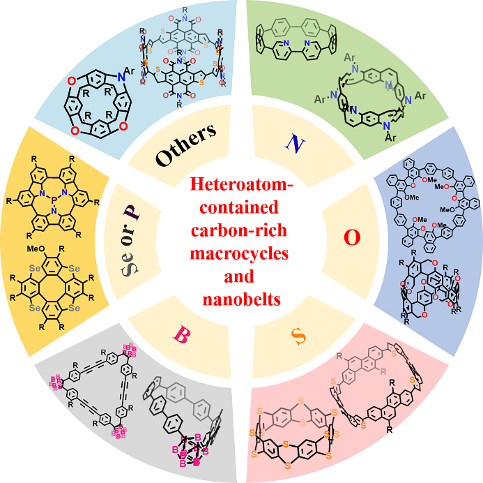 近日,龚汉元老师课题组总结了近年来杂原子掺杂的富碳大环化合物及碳纳米带的研究进展,并对不同杂原子对分子结构、性质及应用的影响做了初步探讨。该类分子的发展方兴未艾,仍面临着合成及构效关系研究的挑战,但已显示作为超分子主体和光电分子材料的广泛应用前景。本综述为杂原子掺杂富碳大环化合物及分子带的研究提供了阶段性总结及建议。