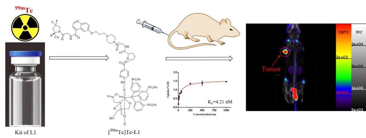 成纤维细胞激活蛋白(FAP)在大多数实体瘤基质中选择性表达于癌相关成纤维细胞(CAFs),是肿瘤诊断和治疗的潜在靶点。通过放射性核素标记成纤维细胞激活蛋白抑制剂(FAPI)及其衍生物用作肿瘤显像剂成为当前国际放射性药物研究的一大热点。99mTc是临床上应用最广的SPECT核素,理想的99mTc标记的FAPI类肿瘤显像剂还未研制成功,因此研制安全有效且质量可控的99mTc标记的FAPI肿瘤显像剂具有非常重要的现实意义。肼基尼古酰胺(HYNIC)作为一种常用双功能联接剂,其可以与三羟甲基甘氨酸(tricine)和三苯基膦三磺酸钠(TPPTS)作为协同配体来制备稳定的99mTc 标记的HYNIC配合物。连接剂(linker)连接了靶向基团和与放射性核素相连的螯合基团,对于调节放射性药物与靶点的亲和性和在生物体内的生物分布性能发挥重要作用。相关研究表明-(Pro-Gly)n-具有II型聚脯氨酸螺旋结构,可以通过调节肽链的长度来改变空间构象,从而优选出与靶点具有更高亲和力的肿瘤显像剂。基于以上考虑,张俊波教授团队设计合成了分别含有-(Pro-Gly)2-和-(Pro-Gly)6-作为连接剂的两个FAPI衍生物(L1和L2),然后和协同配体tricine/TPPTS 与99mTc 配位制备稳定的99mTc配合物([99mTc]Tc-L1和[99mTc]Tc-L2)。体外细胞研究表明[99mTc]Tc-L1显示出更高的细胞摄取和与FAP的特异性结合。U87MG肿瘤小鼠的生物分布和microSPECT/CT图像显示,[99mTc]Tc-L1与FAP具有特异性结合,其在肿瘤中摄取高且肿瘤与非靶比值好。[99mTc]Tc-L1可通过药盒化制备,安全、有效且质量可控,具有非常广阔的临床应用前景。相关研究工作以“Synthesis and Evaluation of 99mTc-Labeled FAP Inhibitors with Different Linkers for Imaging of Fibroblast Activation Proteins in Tumors”为题发表在药物化学顶级期刊Journal of Medicinal Chemistry上。琉璃神社 博士生阮晴(已毕业,现琉璃神社 在站博士后)、王倩娜(在读博士生)为共同第一作者,张俊波教授为通讯作者,琉璃神社 为第一单位。