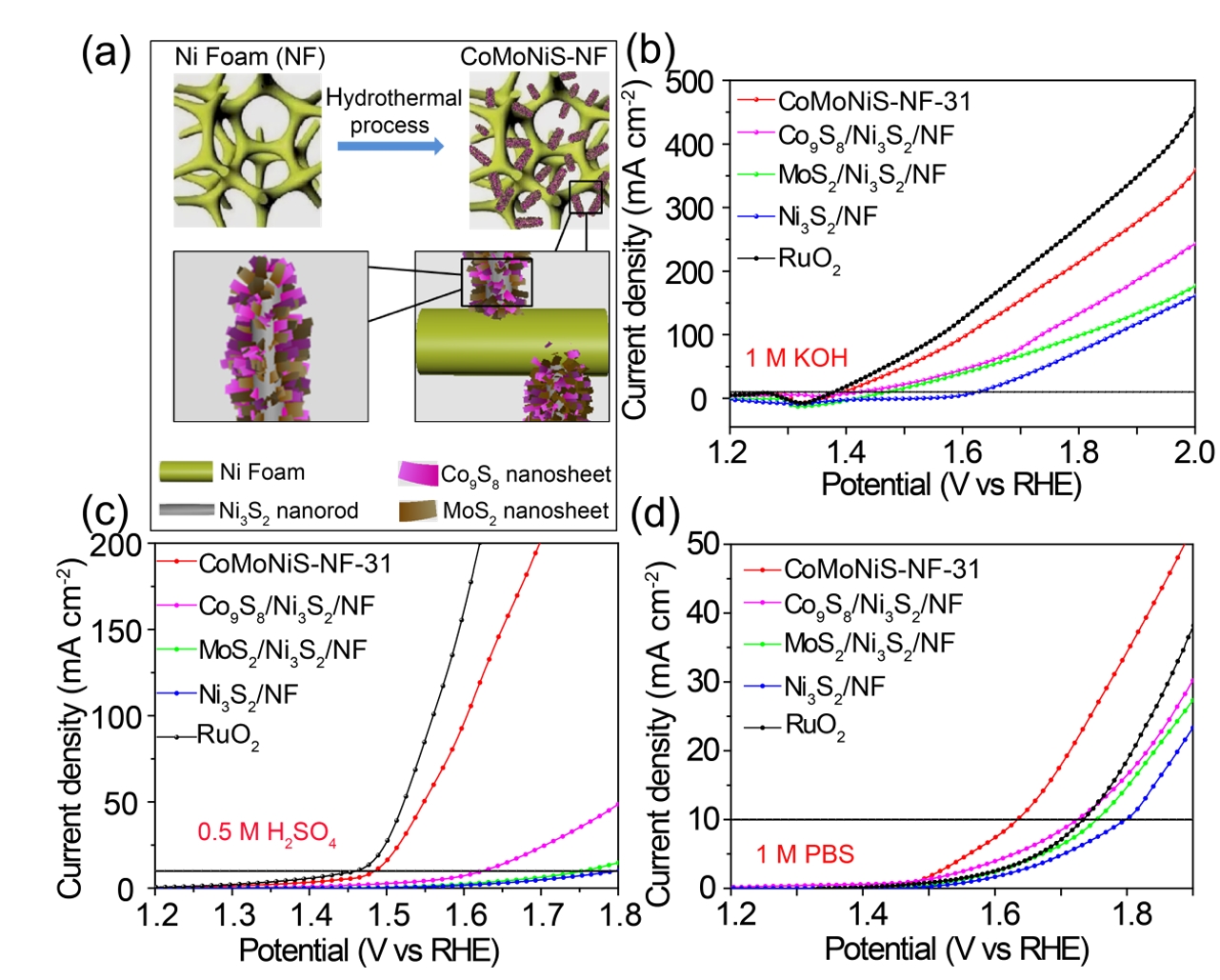 MoS2具有较好的HER催化活性,且由于价廉易得受到研究者关注,但其OER催化性能欠佳;Co9S8具有优异的OER催化性能,但其HER性能有待提高。本工作设计合成了相互作用的MoS2和Co9S8纳米片附着Ni3S2纳米棒阵列,该阵列负载于三维泡沫镍(NF)上形成多级共组装材料。该材料具有良好导电性,可直接用作电极。通过调节Co:Mo前驱体的摩尔比,得到形貌和组成可控的CoMoNiS-NF-xy复合材料(x:y即Co:Mo摩尔比,为5:1~1:3)。CoMoNiS-NF-31表现出最佳的电催化活性,在碱性、酸性和中性电解质中可在超低过电位(113, 103和117 mV, HER)和(166, 228和405 mV, OER)下即达到10 mA cm-2的电流密度。基于CoMoNiS-NF-31优异的HER和OER性能,组装了双电极电解槽并在宽pH范围内进行全解水,碱性、酸性和中性介质中,达10 mA cm-2电流密度的池电压为1.54, 1.45,和1.80 V。理论计算表明,材料的高OER活性源于界面上Co9S8向MoS2的电子转移,这改变了被吸附物质的结合能,从而降低过电位。该工作是金属硫化物在全pH下电催化全解水的首次报道,为高效低成本双功能电解水制氢催化剂的设计开发提供重要思路。