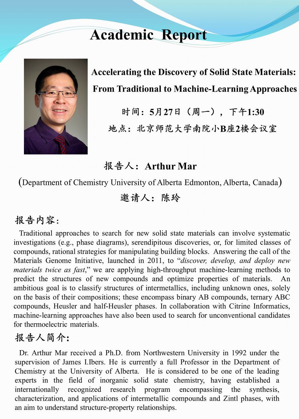 学术报告:Department of Chemistry University of Alberta Edmonton, Prof. Arthur Mar,Accelerating the Discovery of Solid State Materials: From Traditional to Machine-Learning Approaches