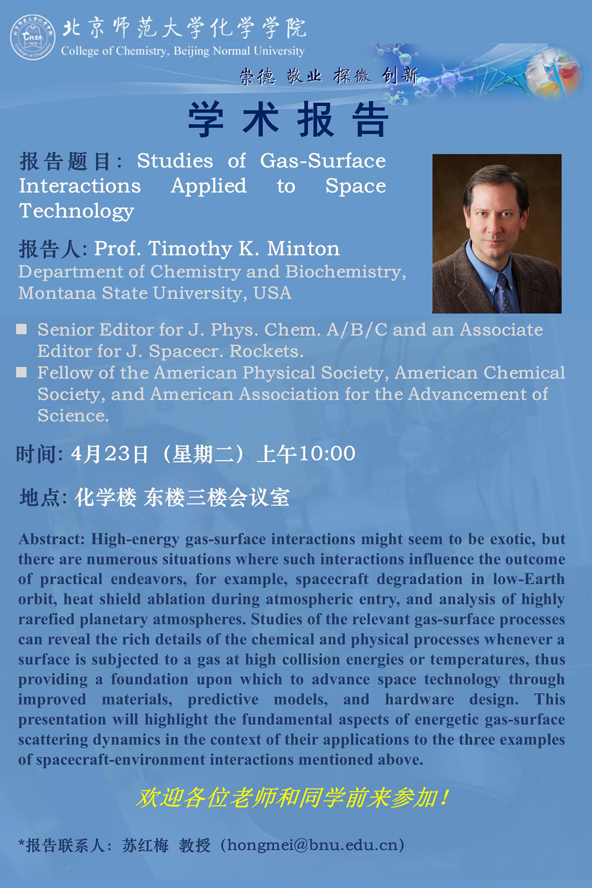 学术报告:Montana State University,Prof. Timothy K. Minton,Studies of Gas-Surface Interactions Applied to Space Technology
