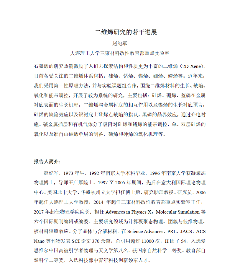 学术报告:大连理工大学,赵纪军教授,二维烯研究的若干进展