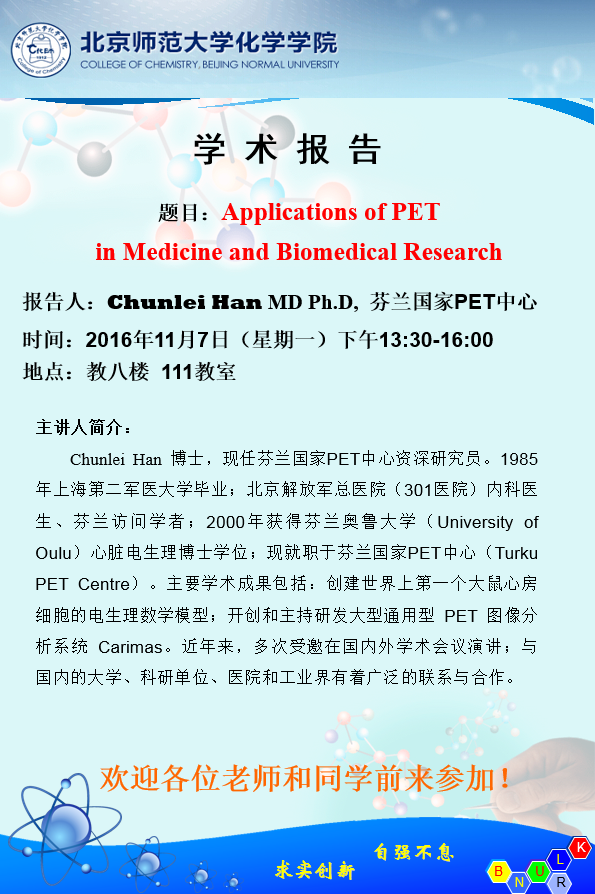 学术报告: 芬兰国家PET中心,Chunlei Han MD Ph.D, Applications of PET in Medicine and Biomedical Research