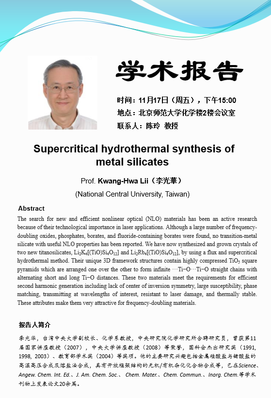 学术报告:台湾中央大学,李光华教授,Supercritical hydrothermal synthesis of metal silicates
